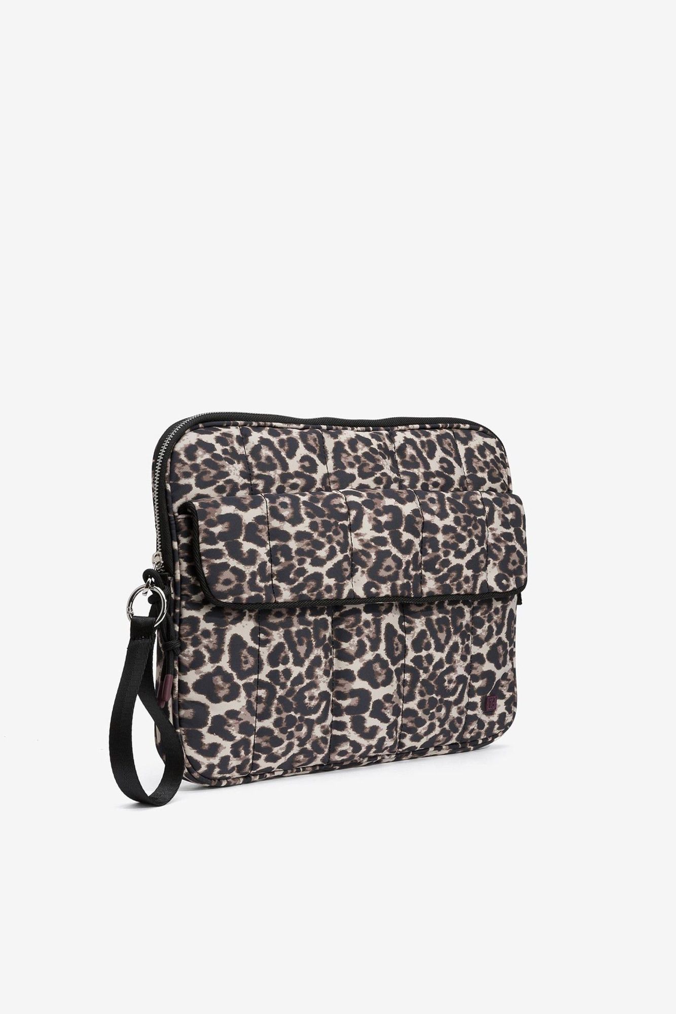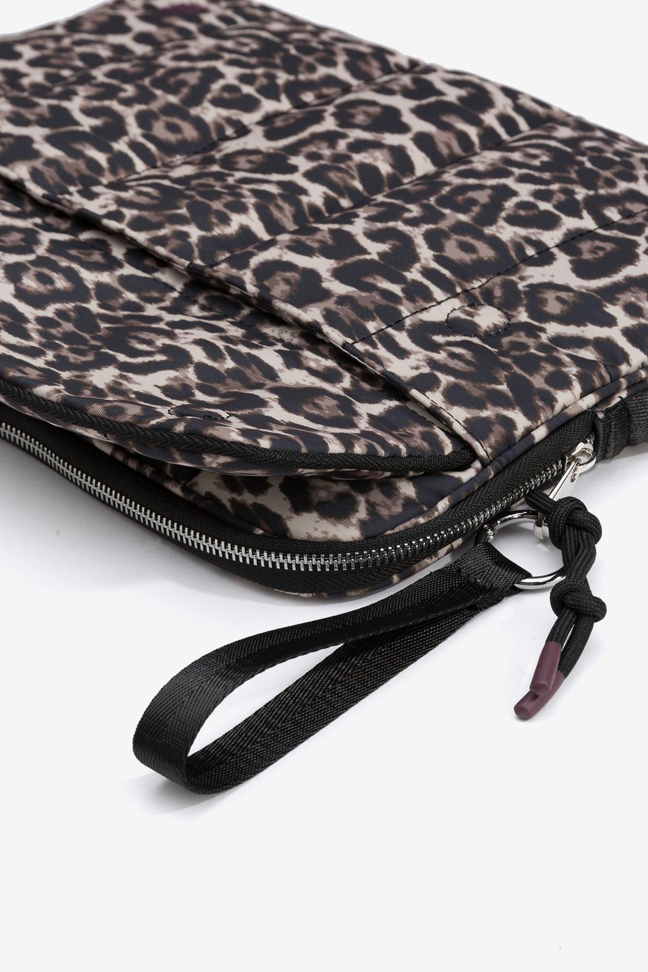 Funda para iPad de nailon acolchado con estampado animal, bolsillo frontal con cierre magnético y cierre superior con cremallera. Asa de mano desmontable. Interior con dos compartimentos de malla.