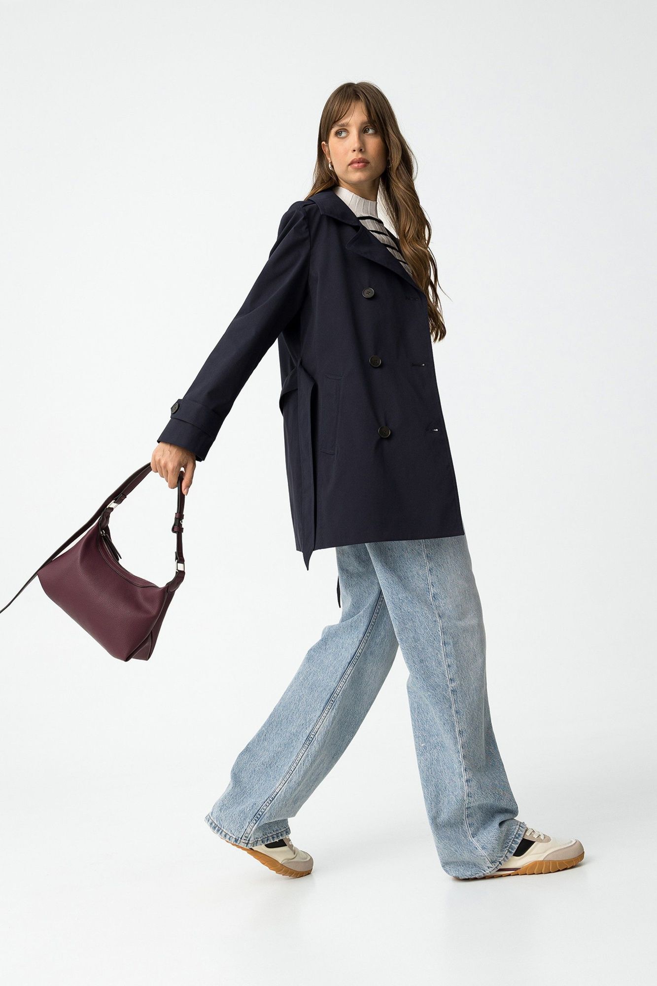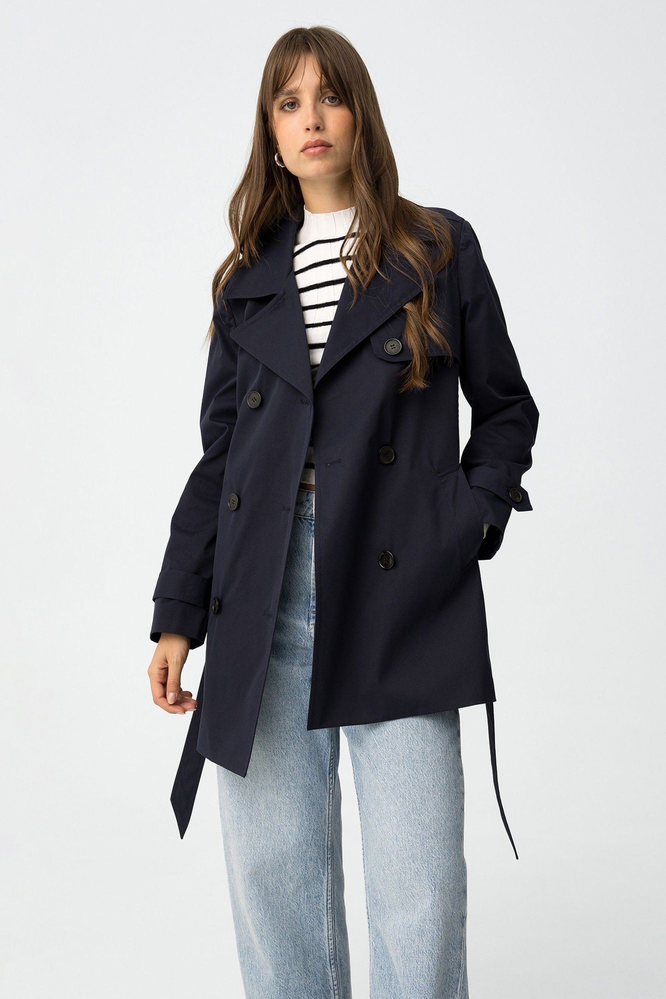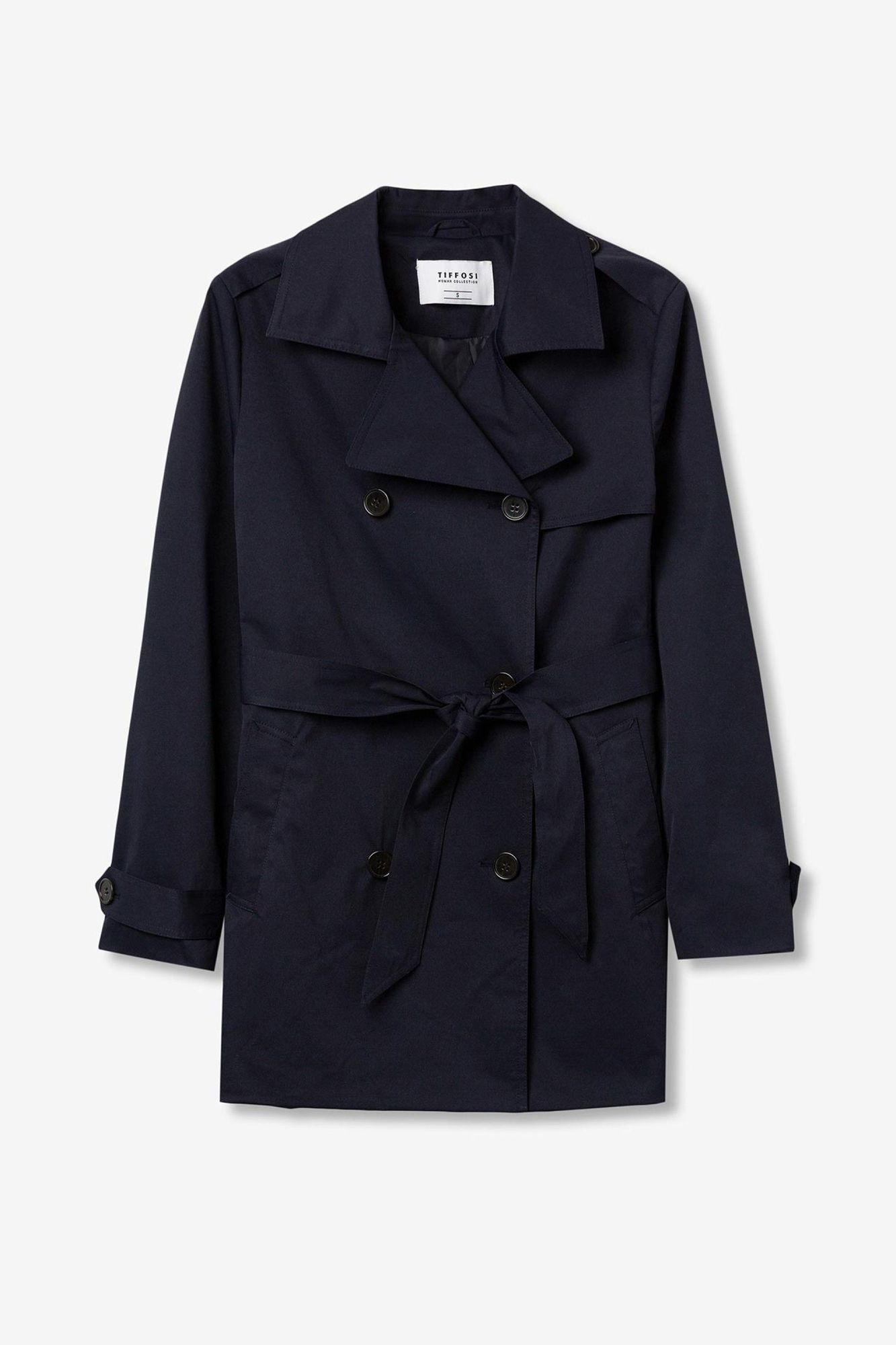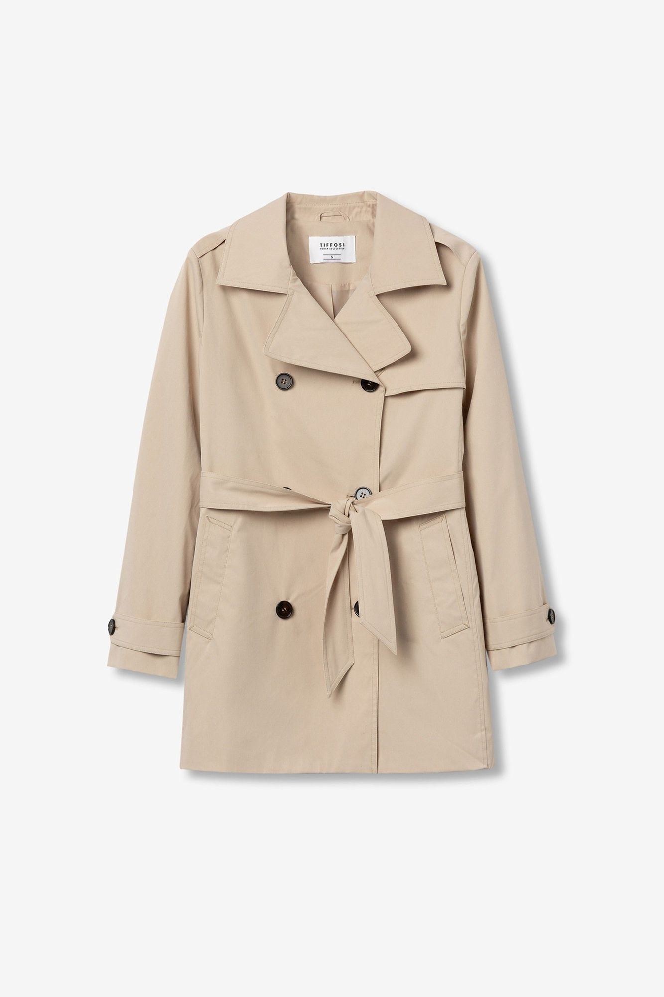 Gabardina regular fit, con cinturón removible y dos bolsillos frontales. Cuello con solapa dentada, cruzado doble con cierre de botón y manga larga.
