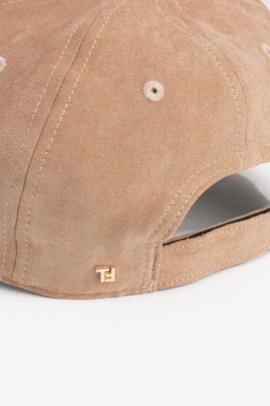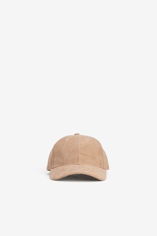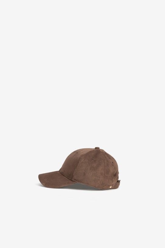Gorra de color chocolate o camel con diseño clásico, acabado efecto ante, ajuste trasero y detalle metálico lateral.