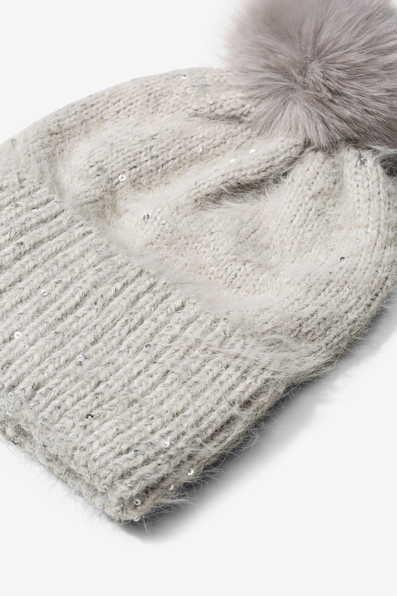 Gorro de punto afelpado con lentejuelas y pompón.