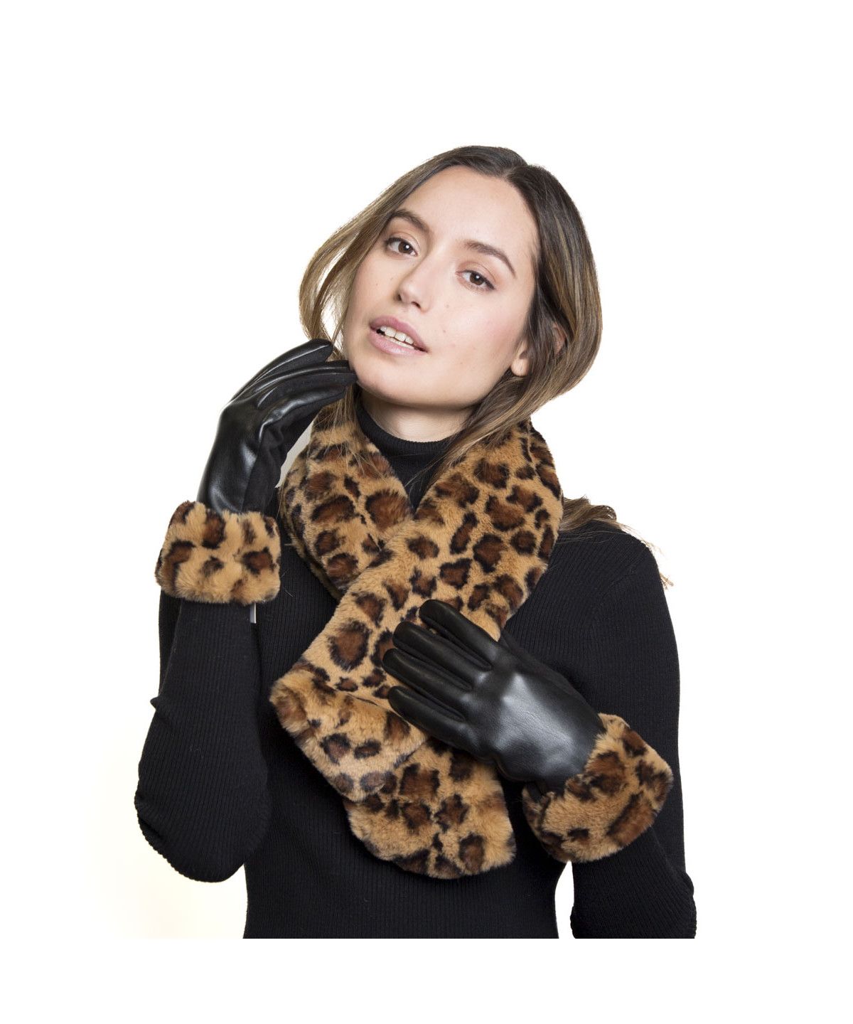 Guante en combinación de cuero sintético y antelina, puño en pelo sintético tipo mutón con estampado leopardo. Medidas: free size. Composición: 100º/ₒ poliéster.