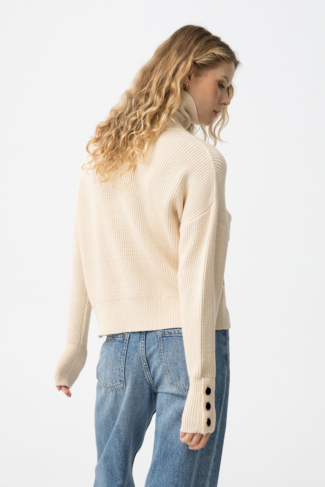 Jersey de manga larga relaxed fit con cuello alto. Punto texturizado de peso medio. Cuatro botones decorativos en puños. Acabados en rib.