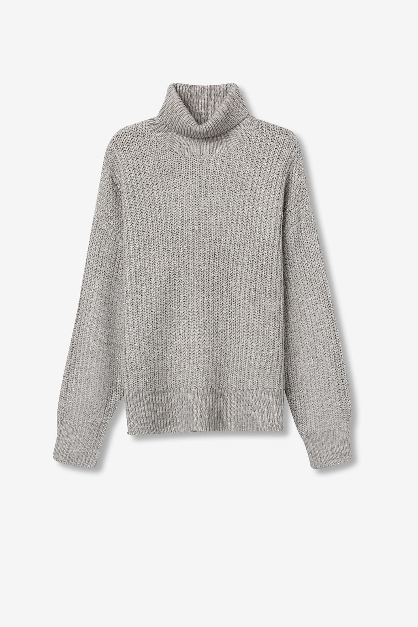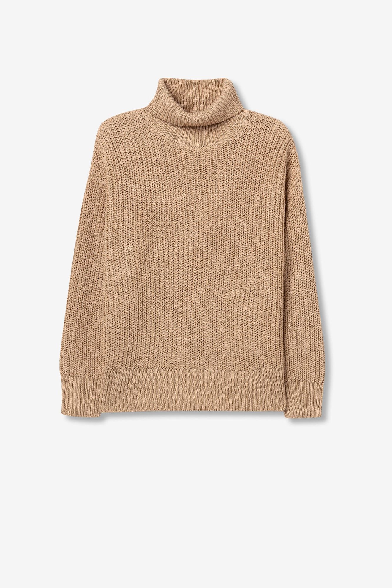Jersey oversized de punto grueso con cuello alto estructurado. Rib en cuello, puños y bajo. Tejido uniforme y silueta voluminosa.