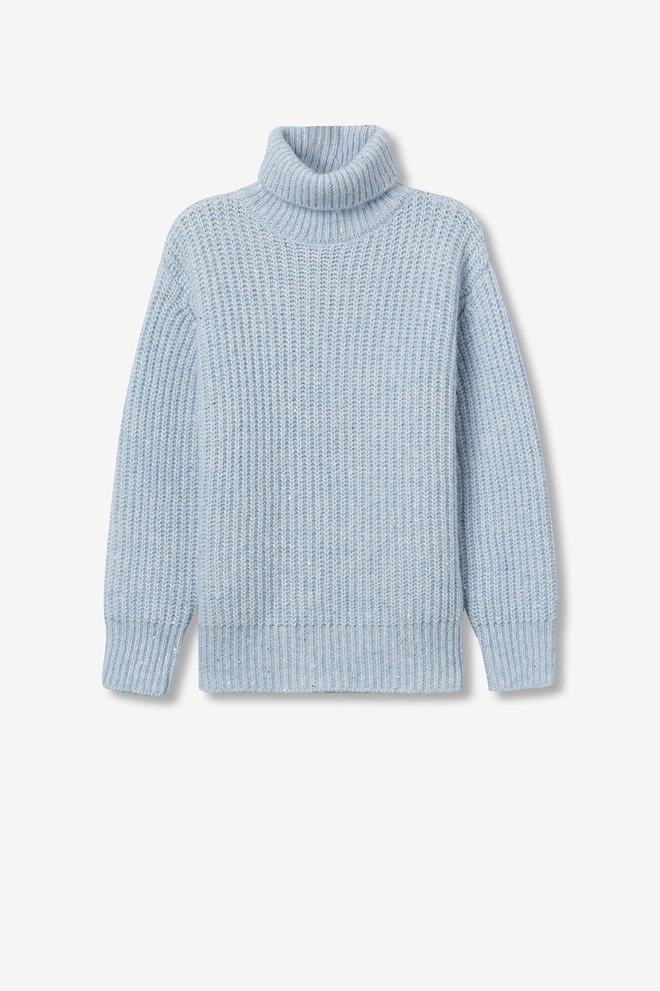Jersey relaxed fit de punto con lana, hilo metálico insertado y lentejuelas. Cuello alto, manga larga, acabados de canalé y bajo con aberturas laterales.