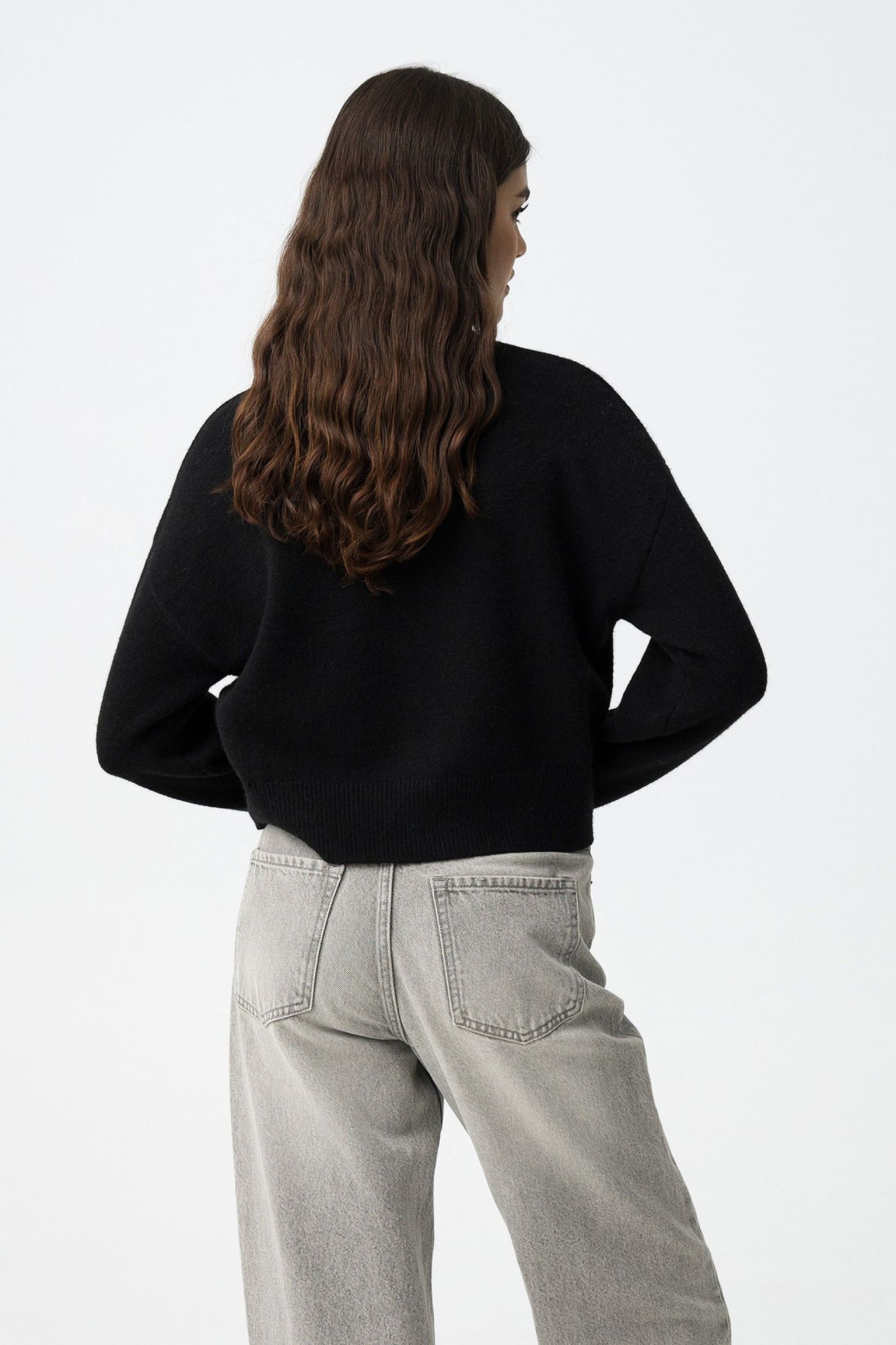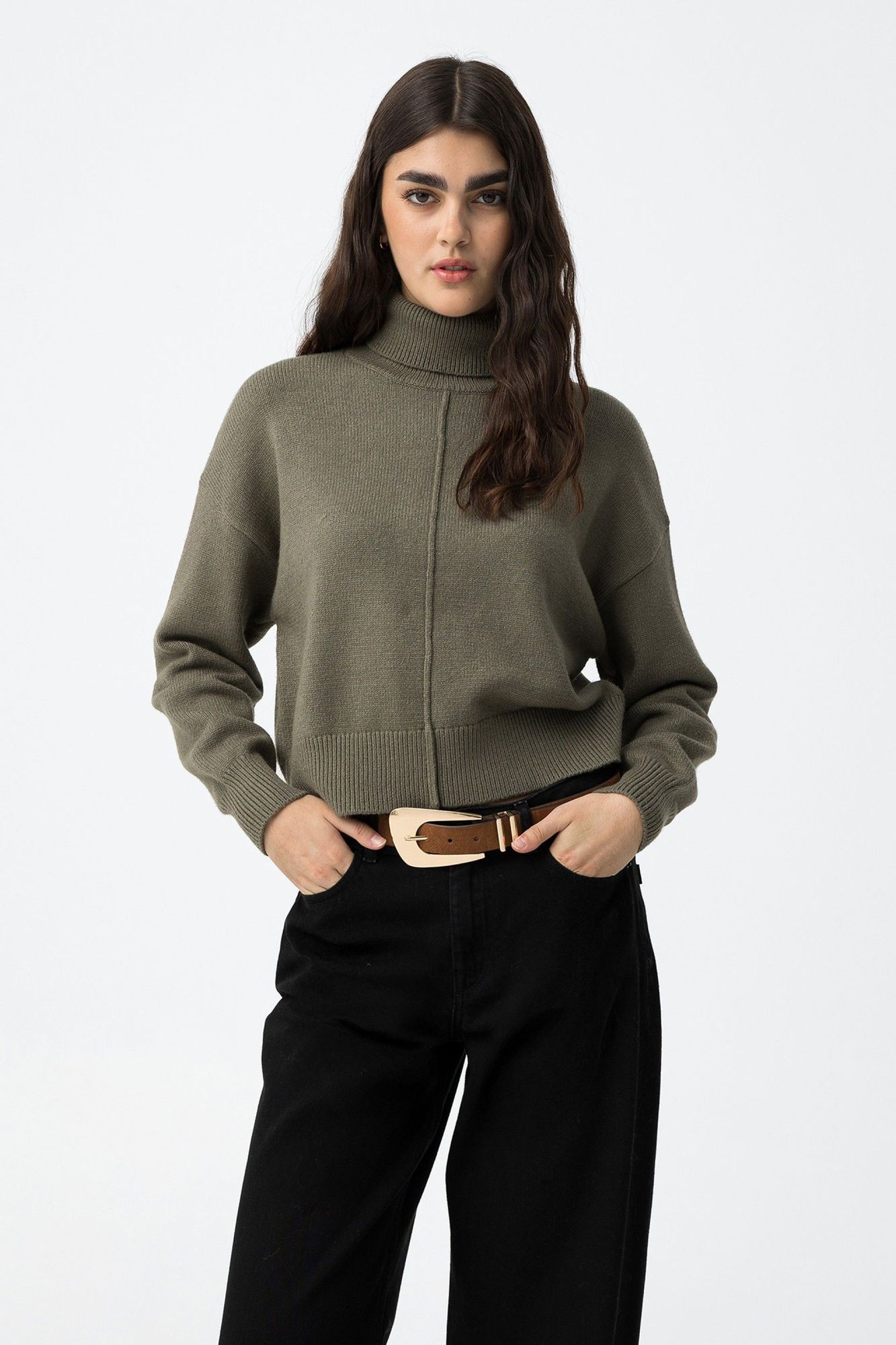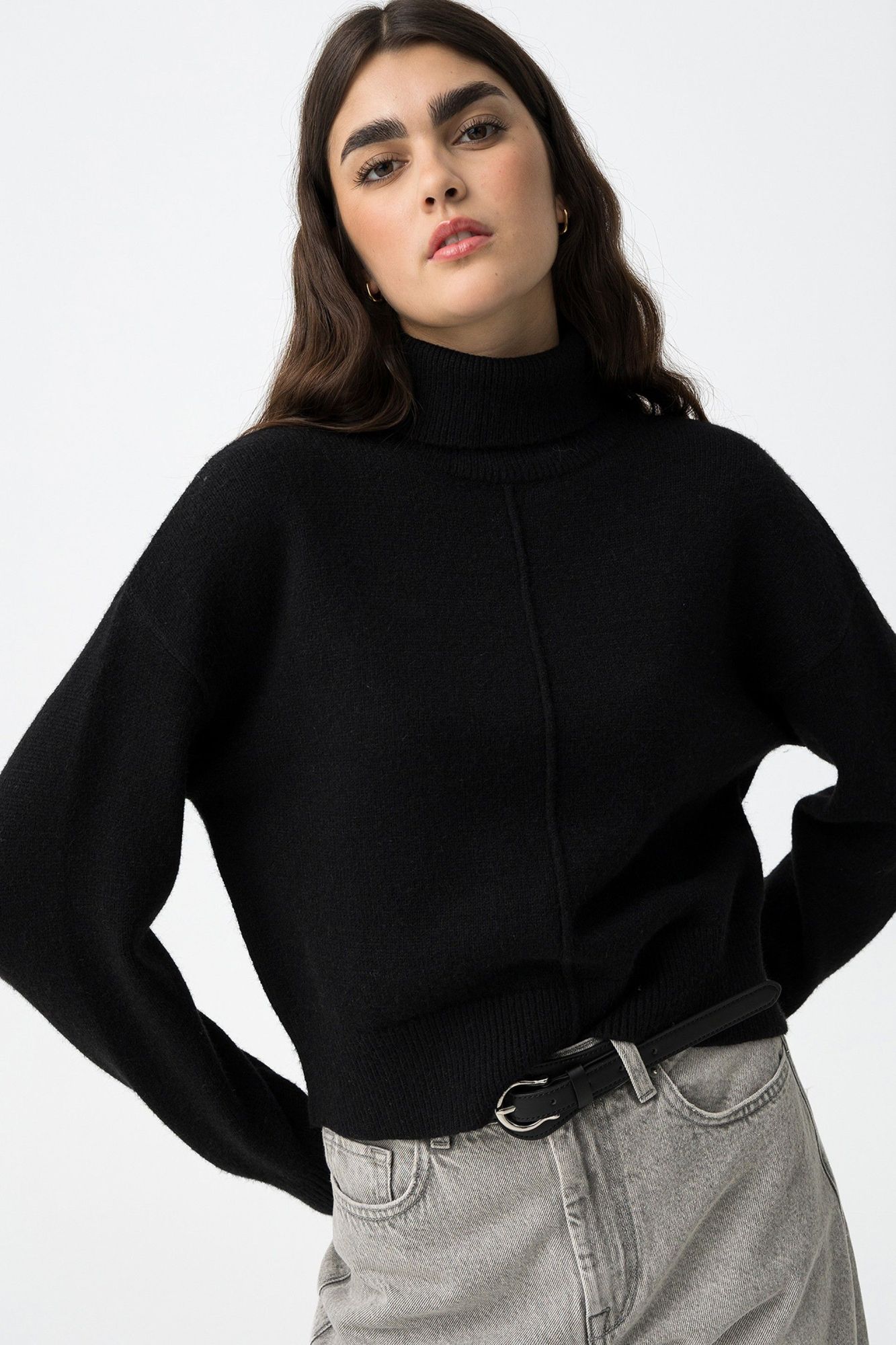 Jersey relaxed fit con costura frontal, cuello alto, manga larga y acabados de canalé.
