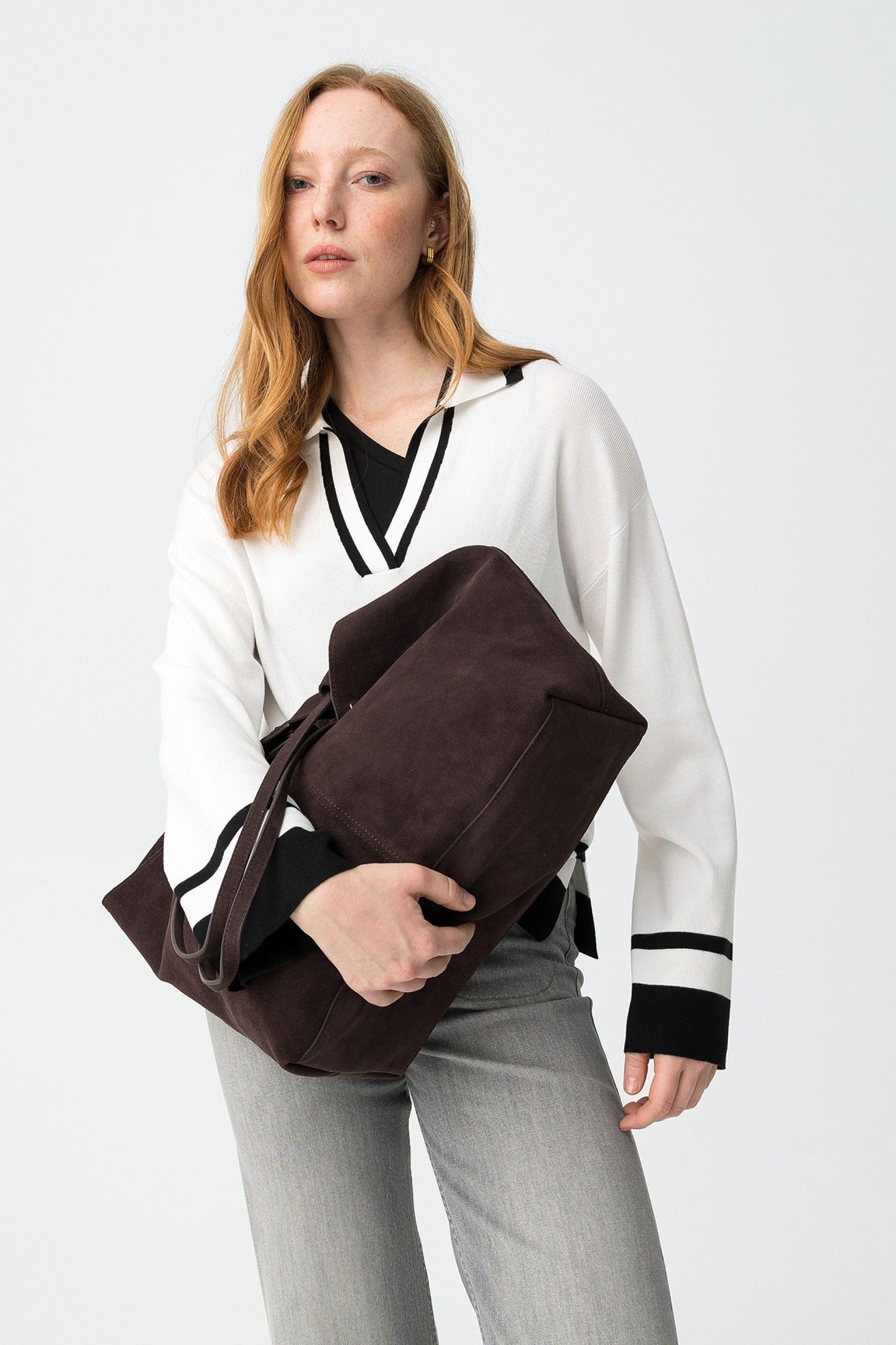 Jersey blanco con rayas negras, corte regular, manga larga y escote en V ancho, rollo minimalista.