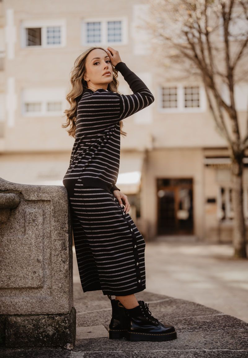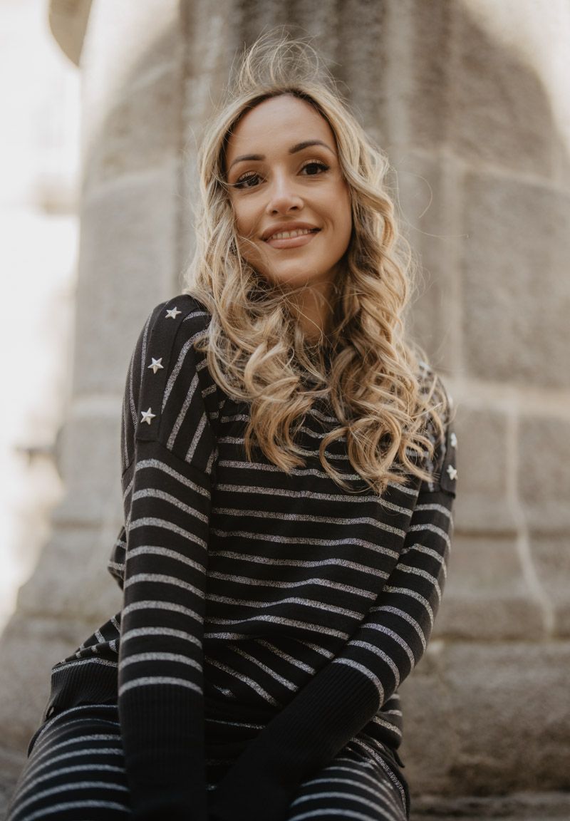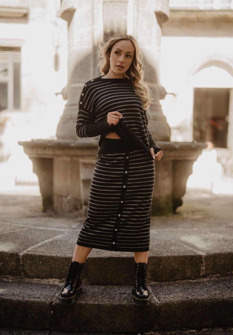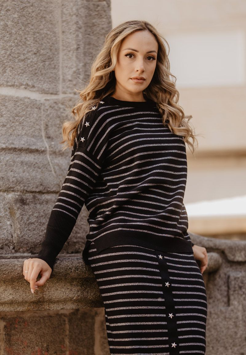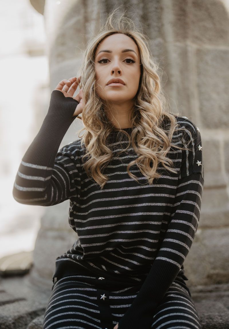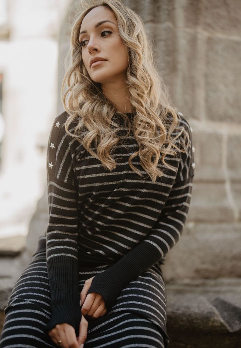 Jersey de rayas de punto, con aplique de estrellas en los hombros. La combinación de rayas y estrellas crea un equilibrio entre lo clásico y lo audaz. Ya nos conoces: alma y coraje.