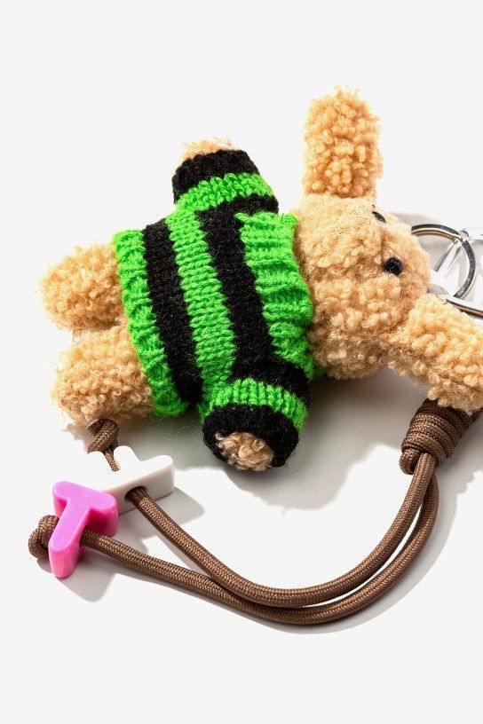 Llavero con peluche en jersey verde y negro, cordón marrón y letras coloridas.