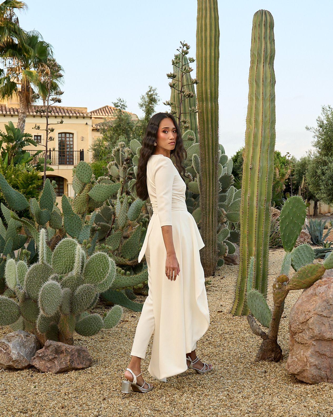 Mono largo confeccionado en tejido de crepé con caída limpia y tacto suave. Presenta escote profundo en pico, manga francesa y corte en la cintura con sobrefalda asimétrica, que aporta movimiento y estiliza la silueta sin recargar.