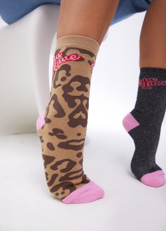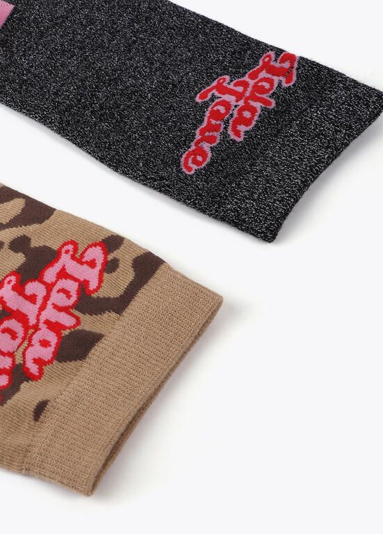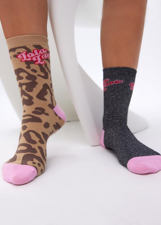 Pack de calcetines con diseño exclusivo de print animal y lurex brillante. Fabricados en algodón suave con refuerzo en talón y punta. Elástico cómodo que mantiene la forma. Ideales para un toque divertido y elegante.