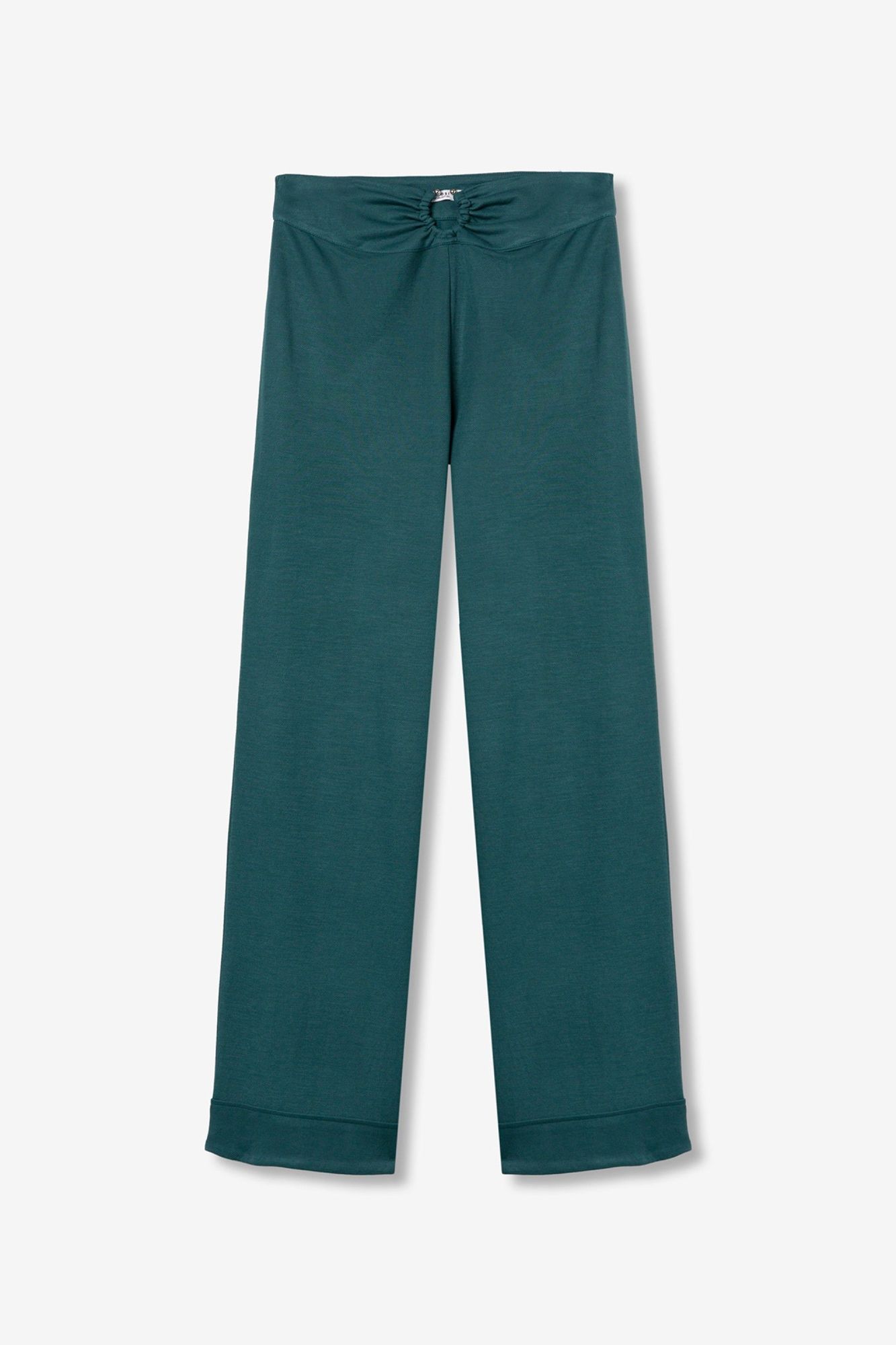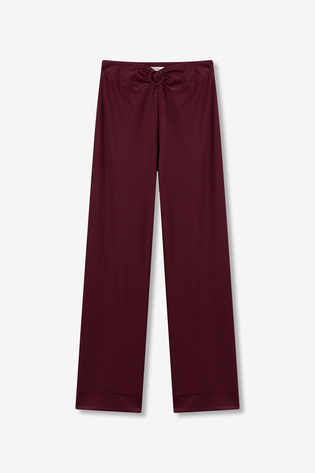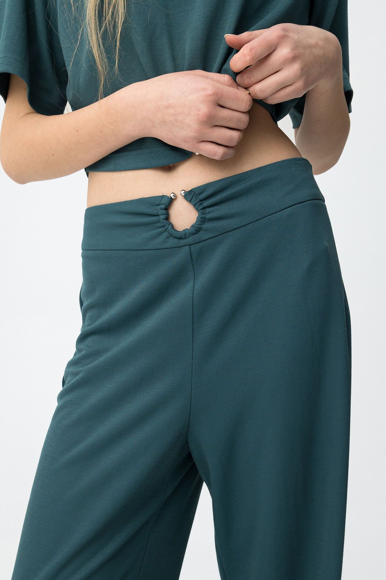 Pantalón de corte ancho con detalle metálico en la cintura, estilo actual y relajado.
