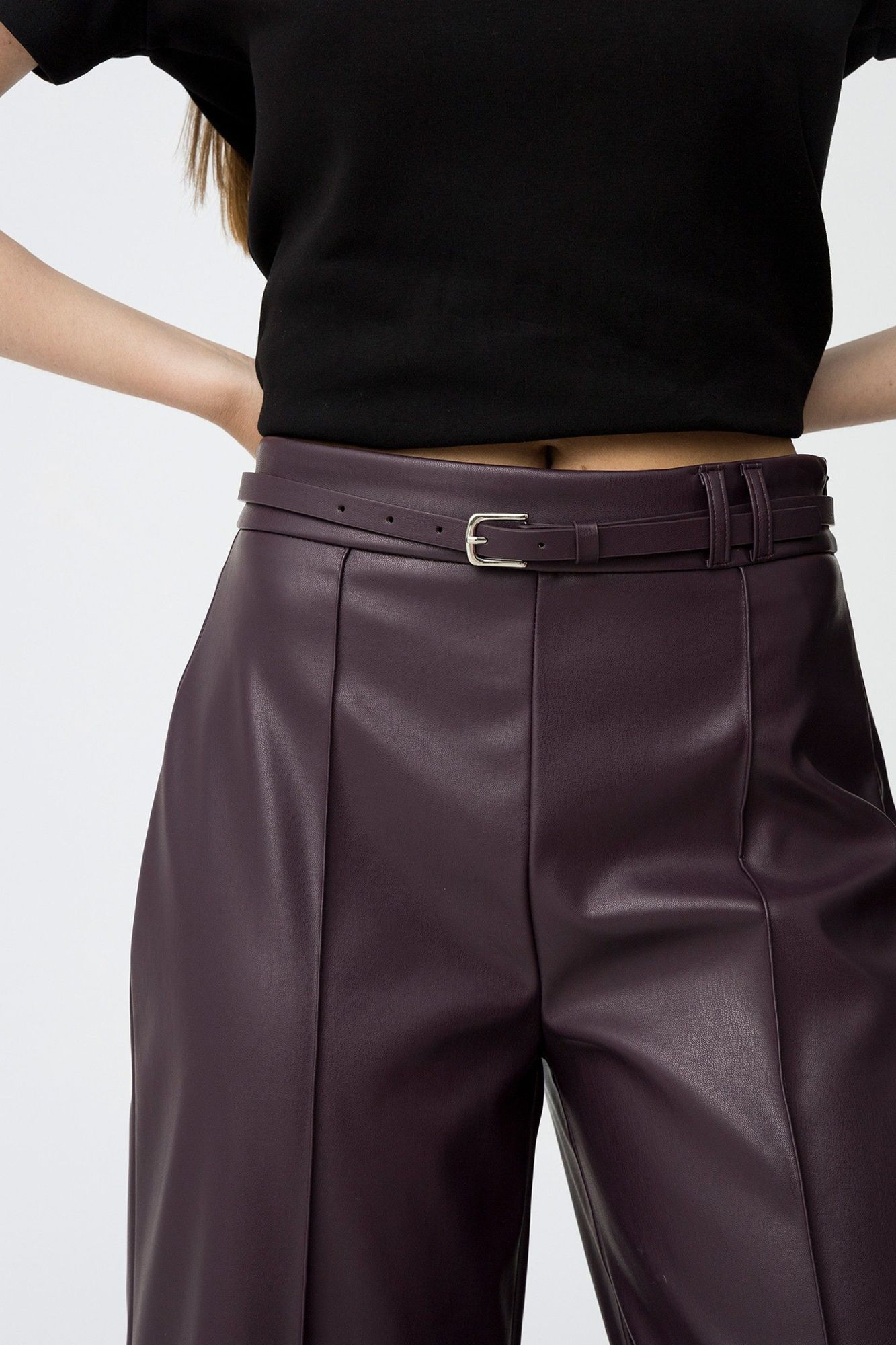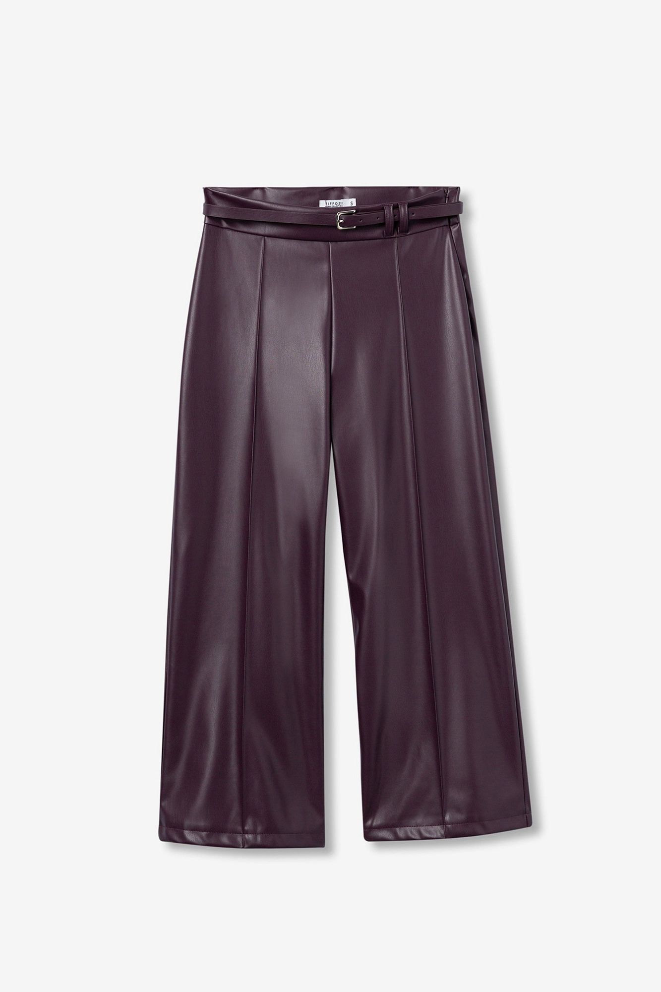 Pantalones culotte efecto piel, con costuras frontales, cinturón removible y cierre de cremallera lateral.
