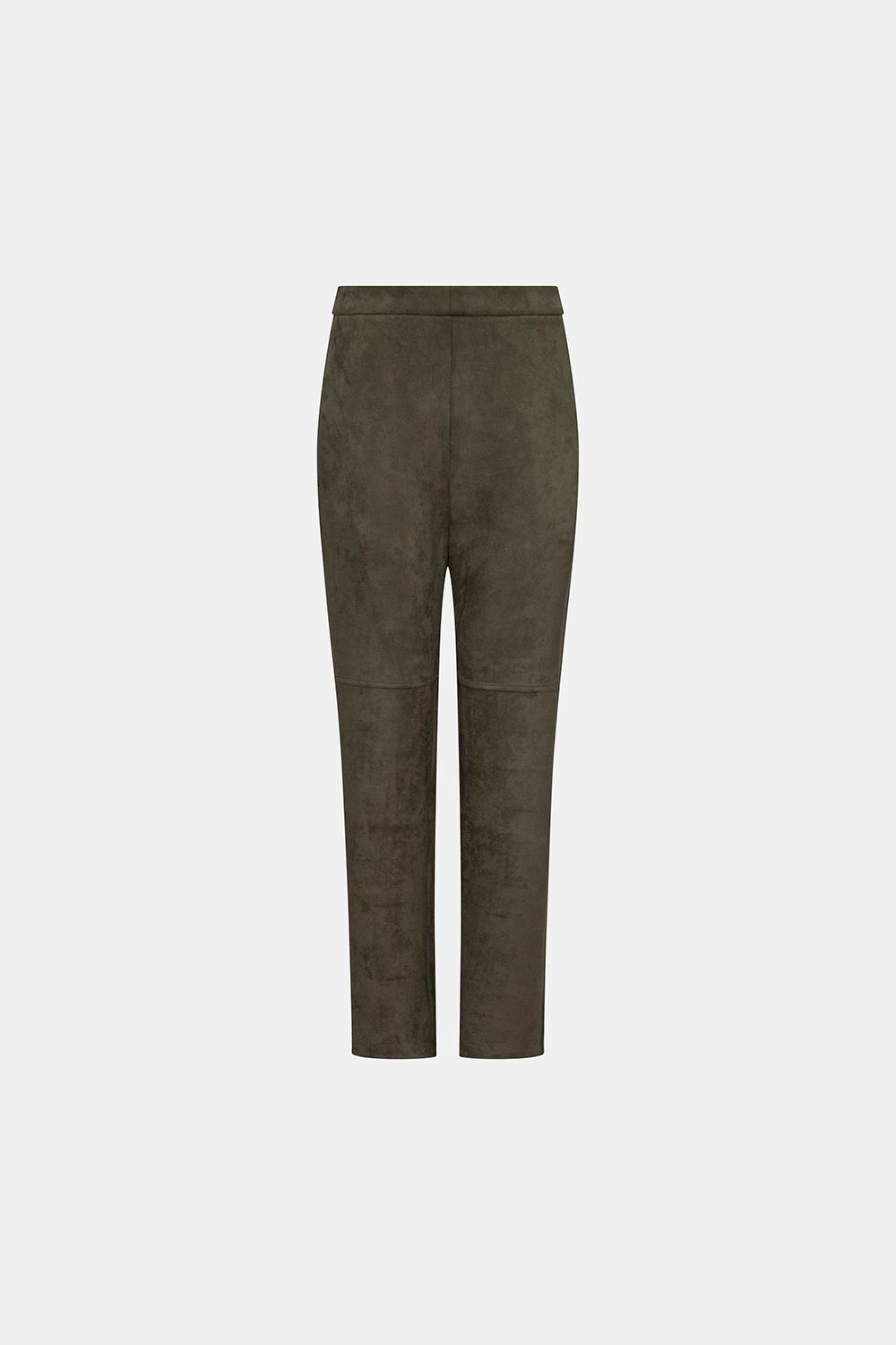 Un básico versátil con mucho estilo. Este pantalón de antelina en color kaki destaca por su suavidad al tacto y su corte recto que estiliza la silueta. De tiro medio y con costura marcada en la pernera, es perfecto para crear looks urbanos y chic, combinando tanto con botines como con deportivas.