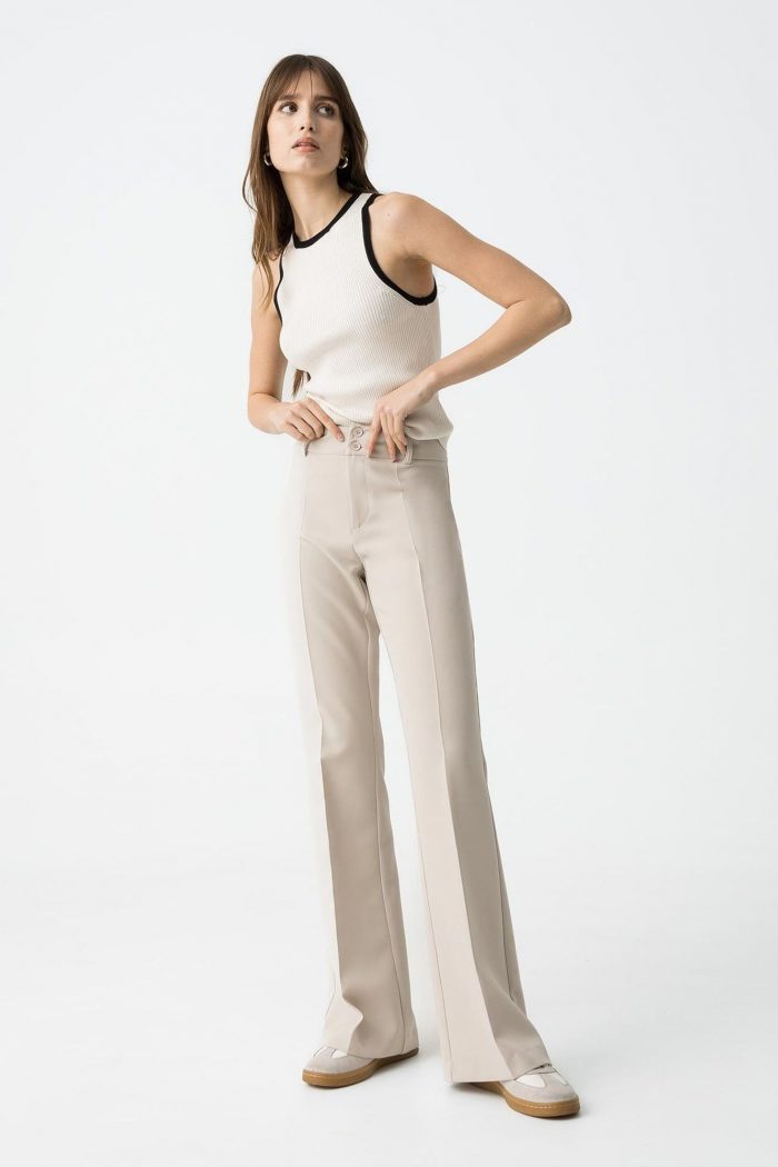 Pantalones de sarga con cremallera oculta y corchete en uno de los lados de la cintura. Piernas estrechas con pliegues al frente y detrás y la parte inferior acampanada con abertura lateral.
