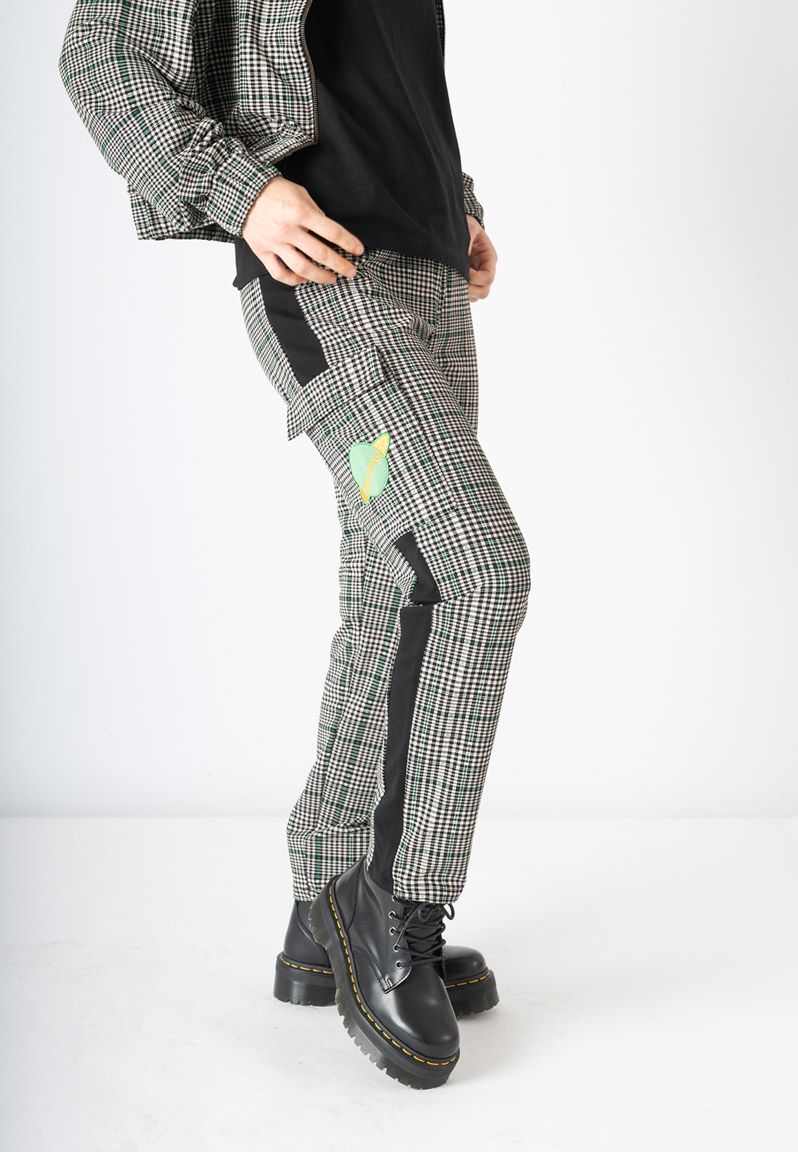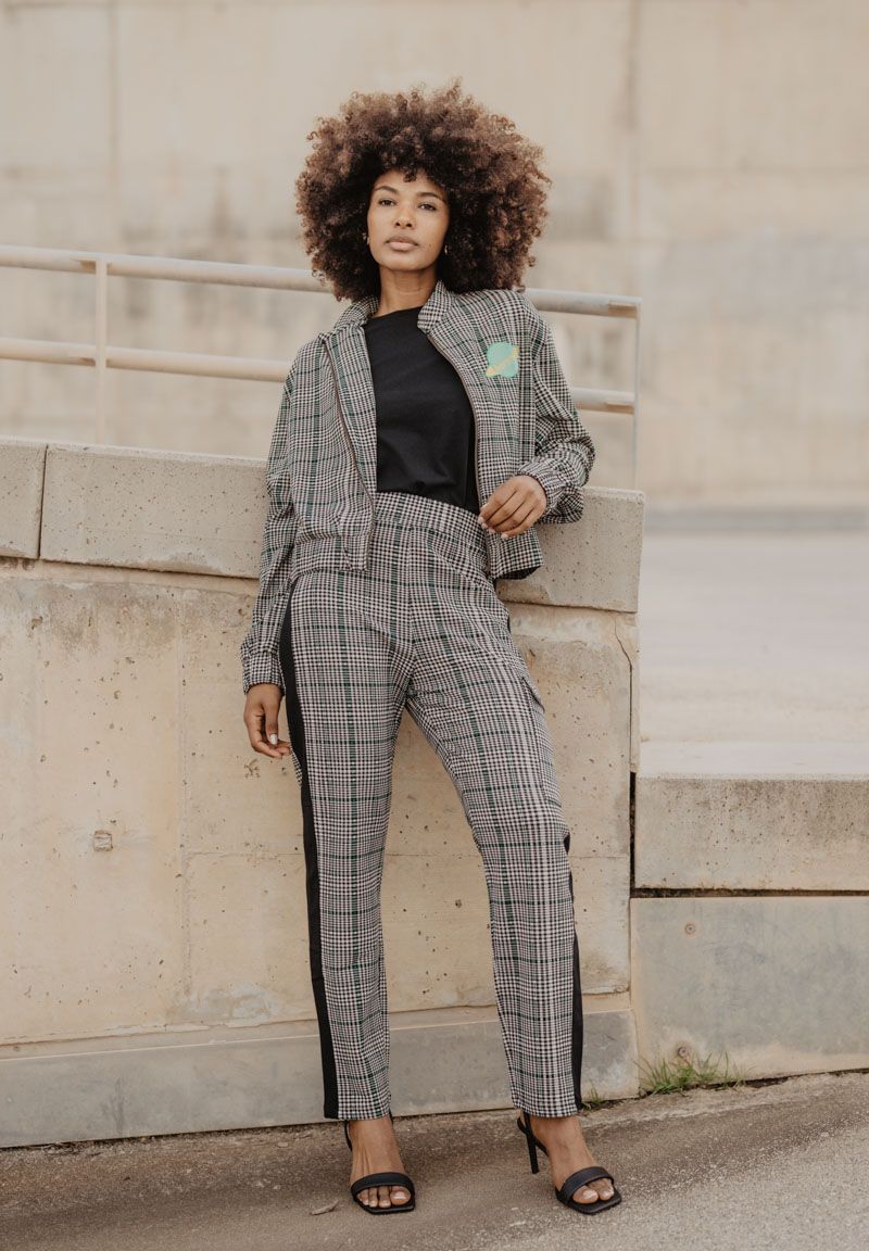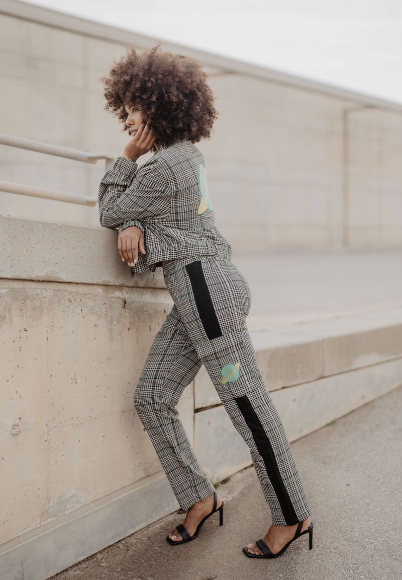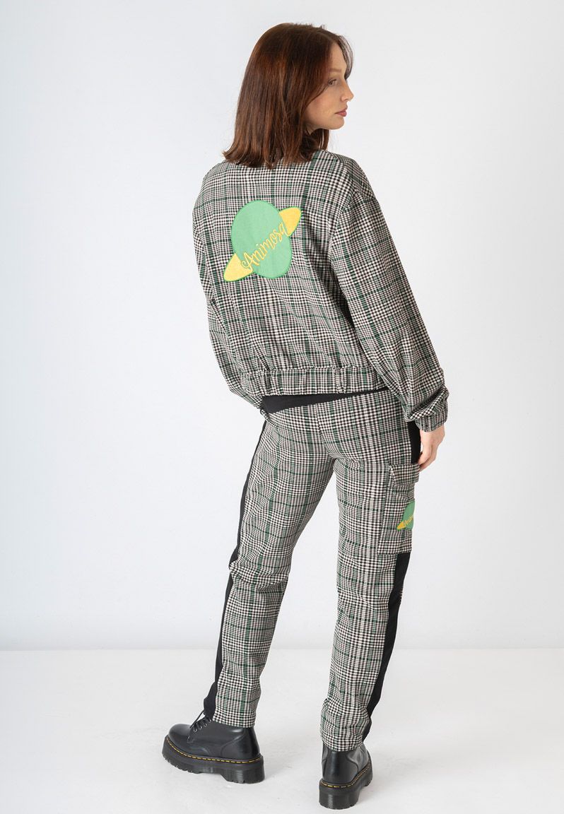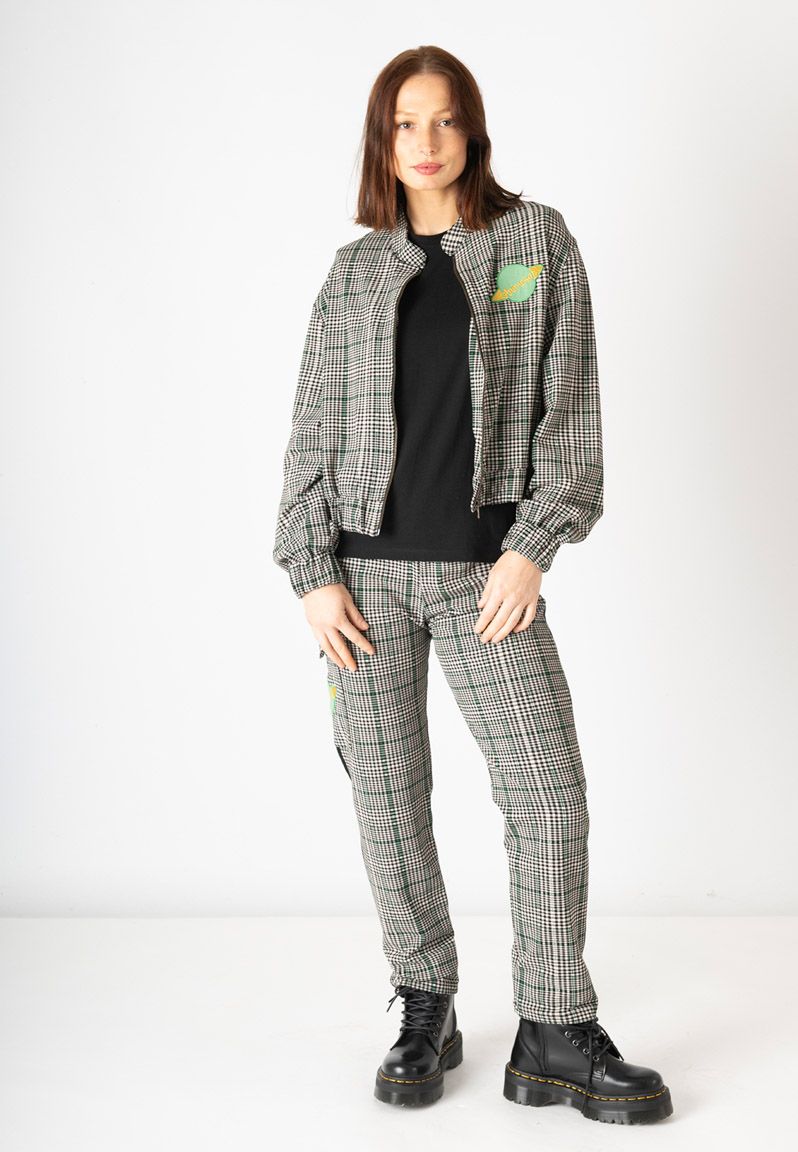Pantalón con estampado de cuadros y detalle de líneas en verde. Con una franja negra en el lateral y un bolsillo con solapa que lleva nuestro planeta bordado. Nuestra inspiración es Caroline Herschel, una astrónoma alemana que identificó gran cantidad de estrellas, cometas y demás constelaciones del sistema solar. Nosotras la hemos convertido en planeta. Diseño propio y fabricación en Portugal, cuidando hasta el más mínimo detalle. Todas nuestras prendas incluyen una etiqueta con un texto inspirador que puedes usar como marcapáginas. Las modelos llevan una talla S.