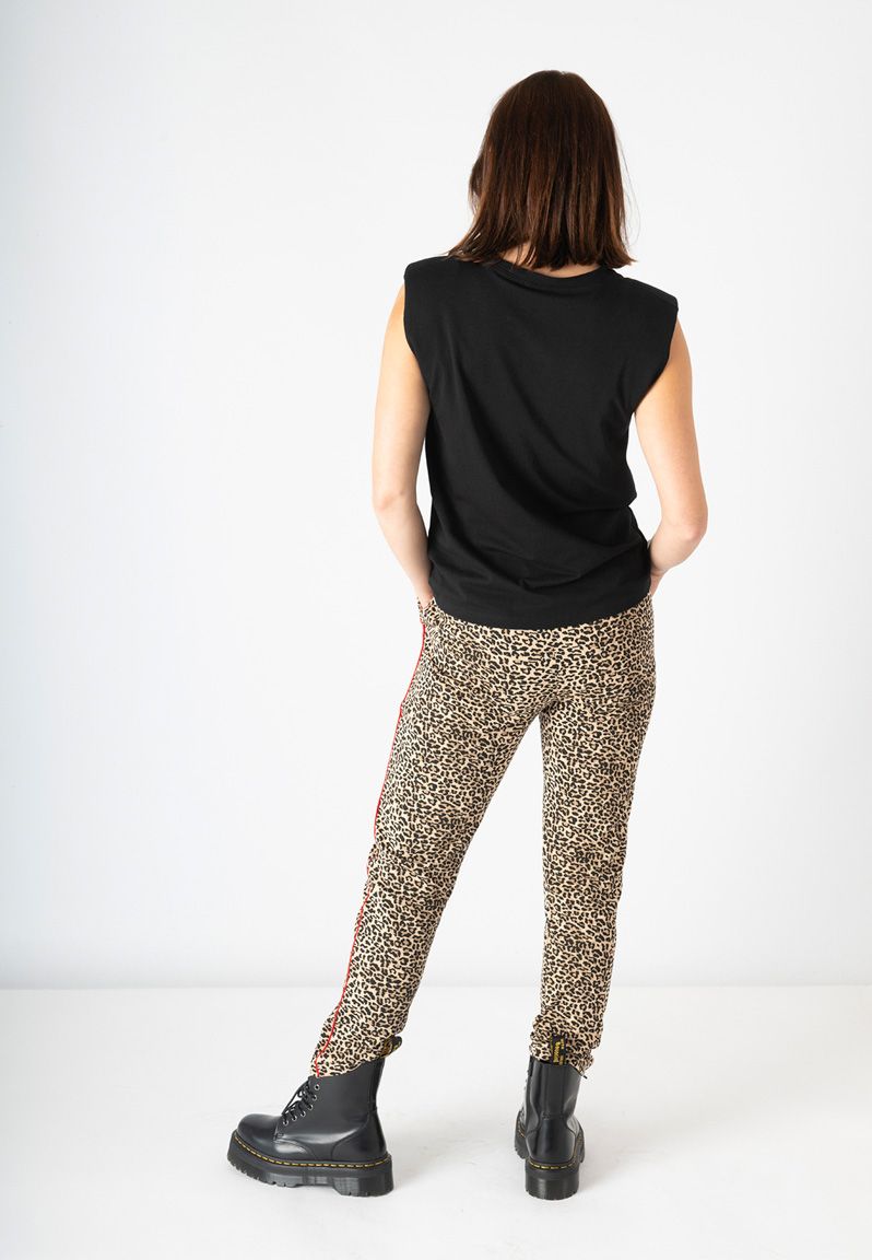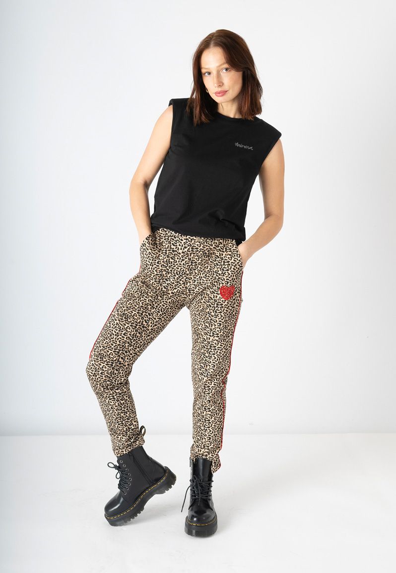 Pantalón con vivo rojo en el lateral. Cintura elástica. Comodísimo, con bolsillos.¿Sabes esa combinación perfecta entre la ternura y la fuerza? ¿Entre la cabeza y el corazón? Sí somos. En el diseño: la fuerza del animal print junto con la rosa bordada en forma de corazón. Puro alma y coraje, lo mires por donde lo mires. Diseño propio Animosa y fabricación en Portugal, cuidando hasta el más mínimo detalle. Todas nuestras prendas incluyen una etiqueta con un texto inspirador que puedes usar como marcapáginas. Las modelos llevan una talla S.