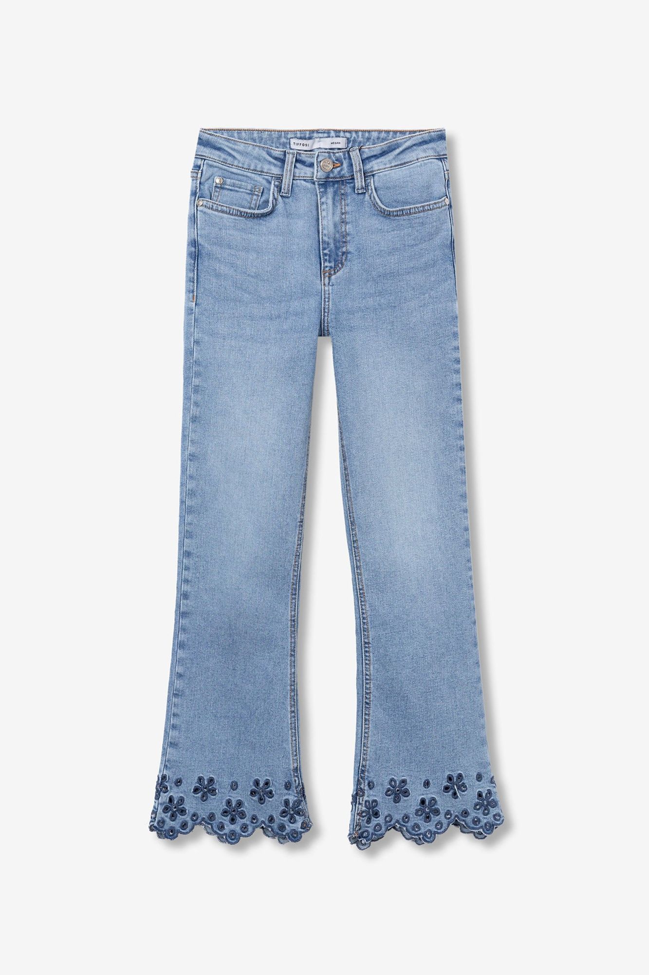 Vaqueros de corte cropped flare en azul claro con bordado floral en el bajo.