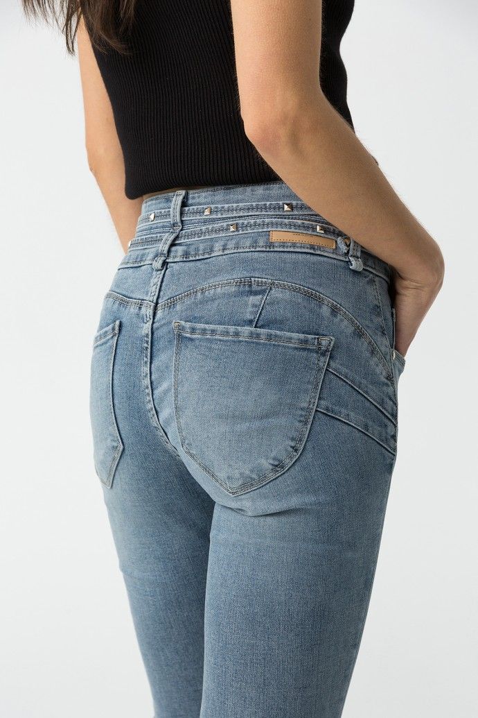 Jeans ajustados de cintura alta con cinco bolsillos. Cierre frontal con cremallera y botones metálicos. Detalle de cinturón de mezclilla con tachuelas. Efecto Doble Push Up.