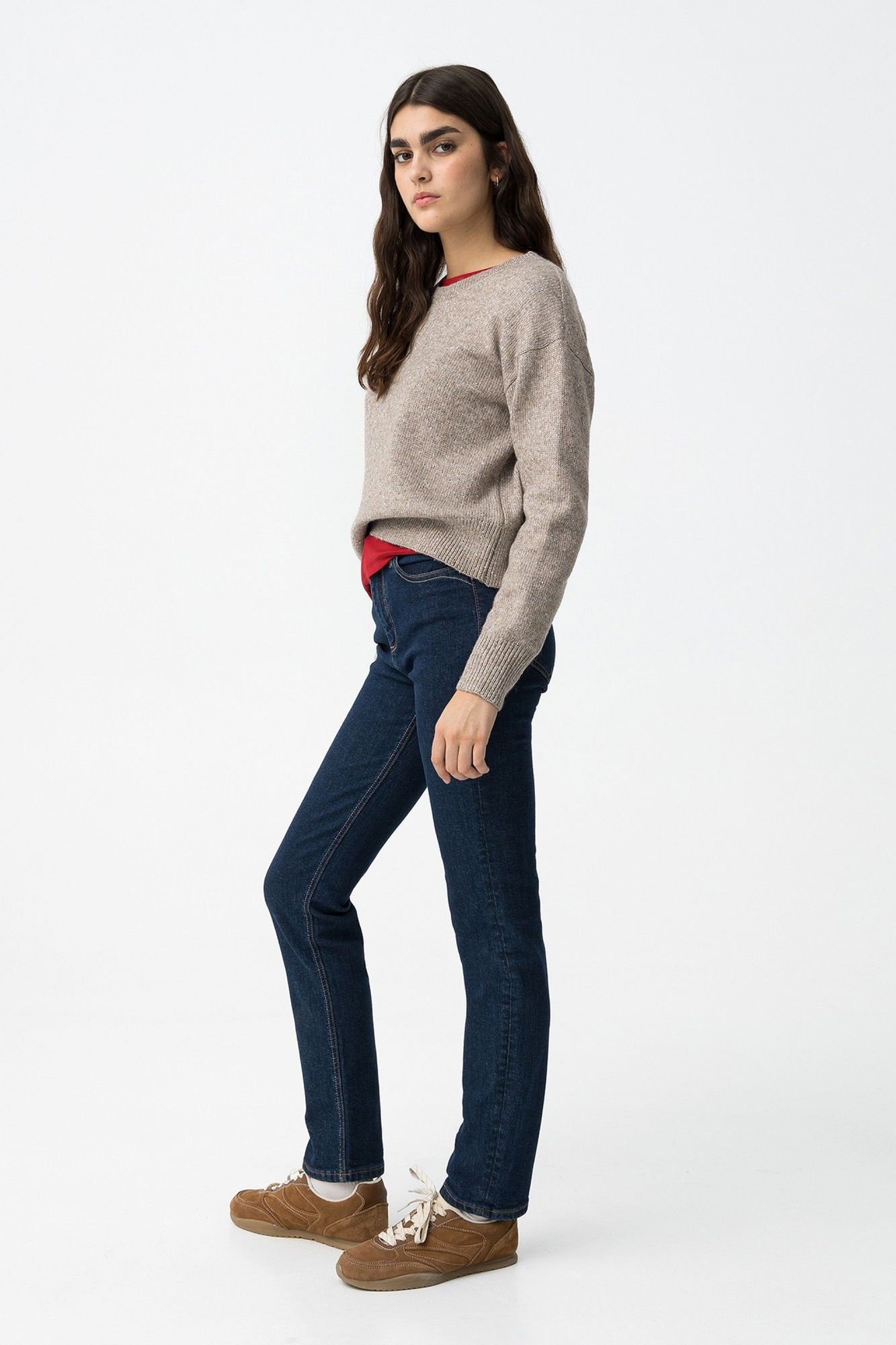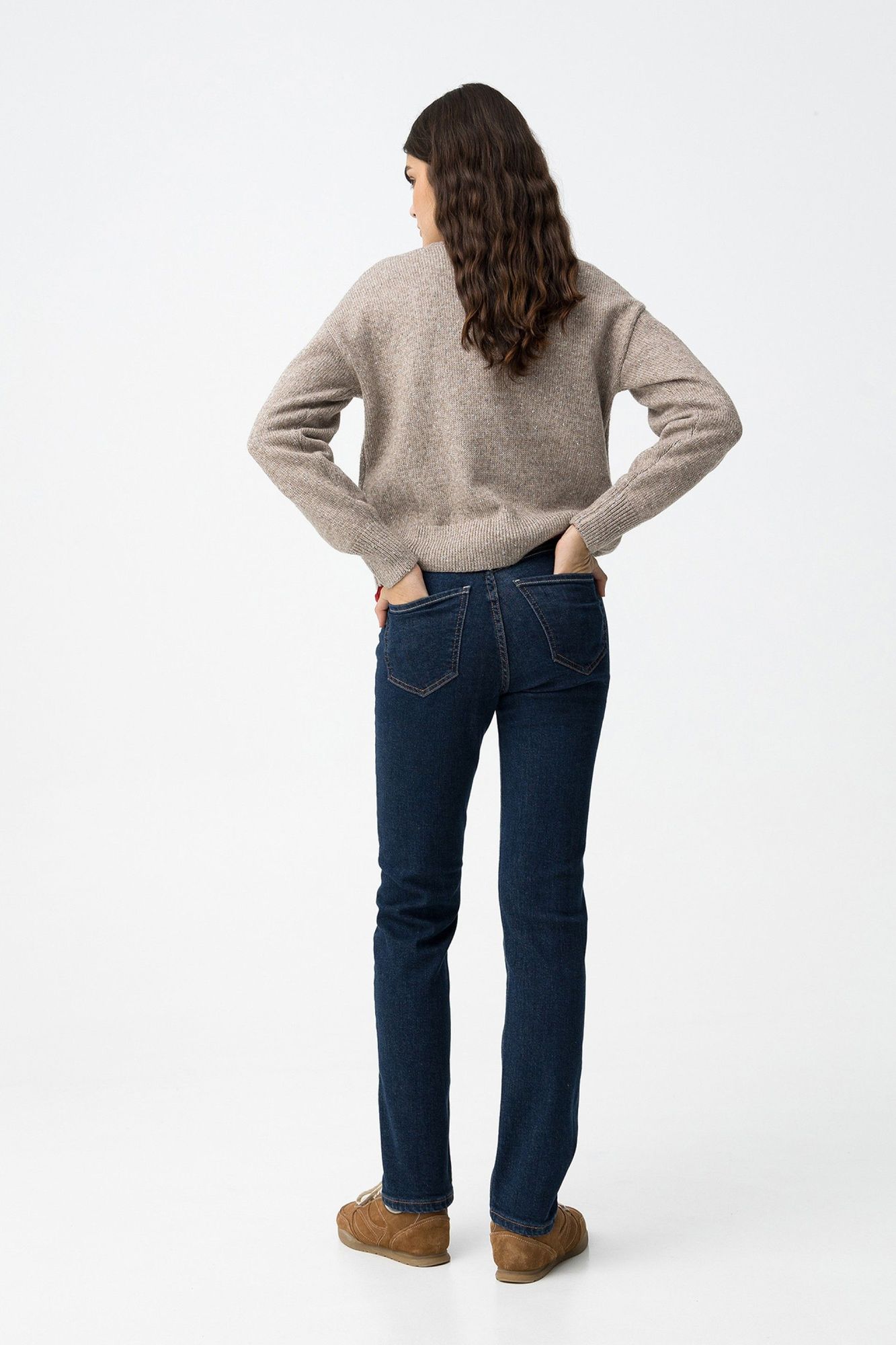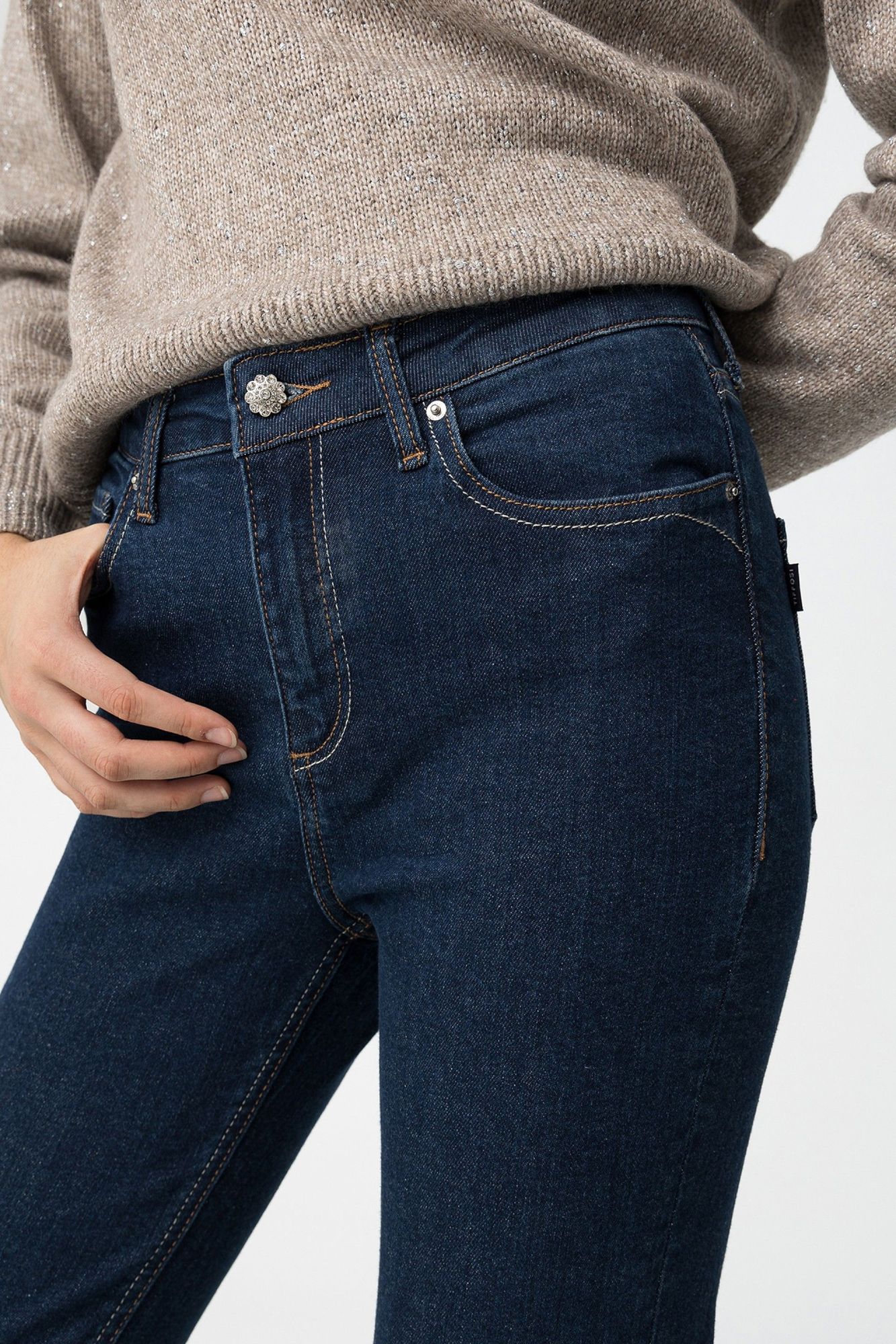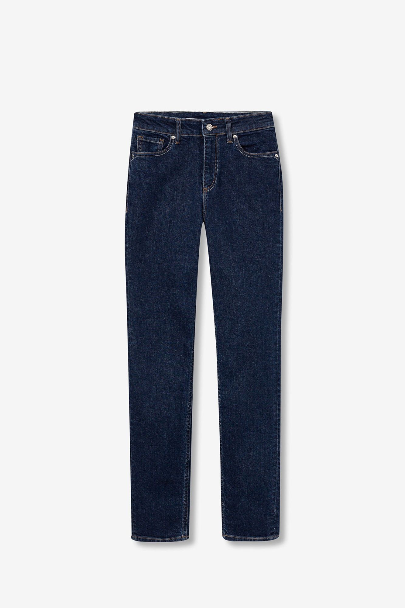 Vaqueros de corte slim en azul oscuro, con cinco bolsillos y cierre de botón joya y cremallera.