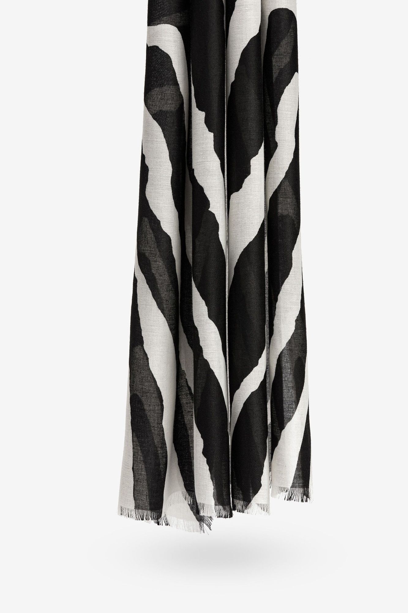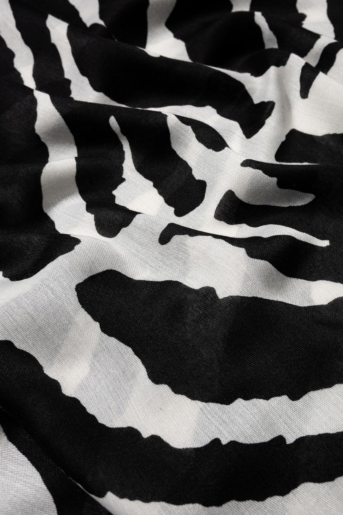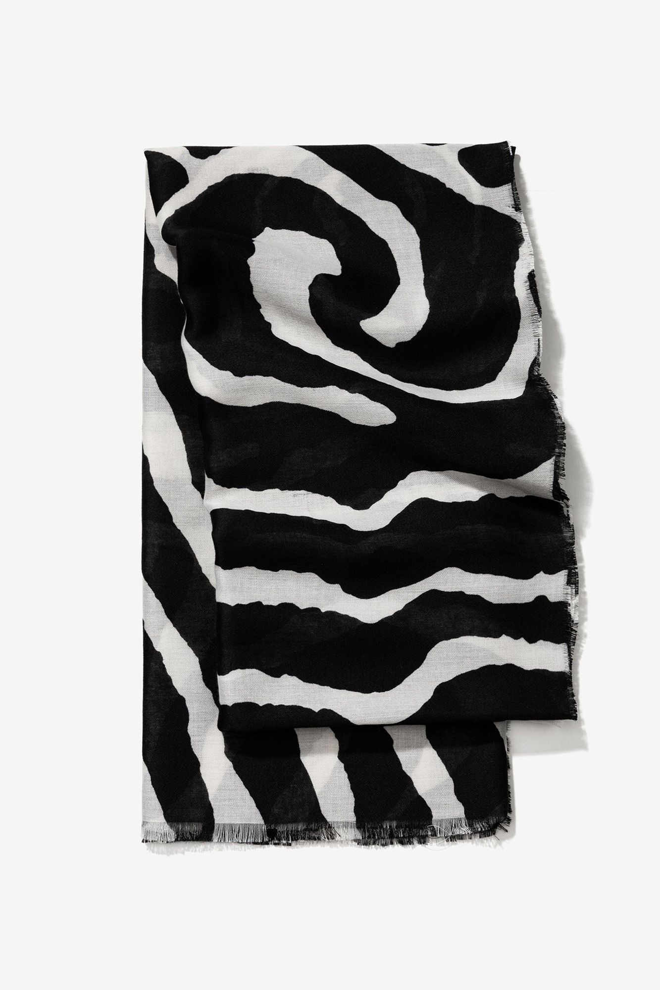 Pañuelo rectangular con estampado de cebra y acabado deshilachado.
