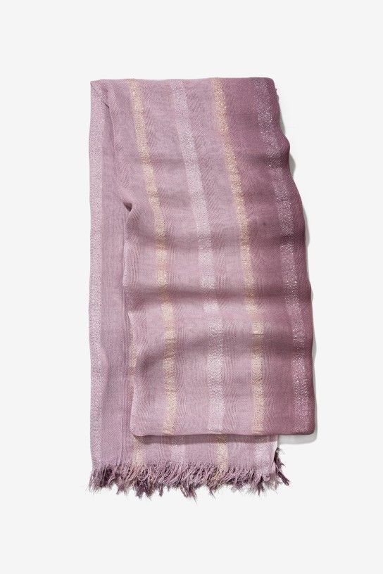 Pañuelo lila con sutiles brillos dorados y bordes deshilachados, ideal para un toque chic.