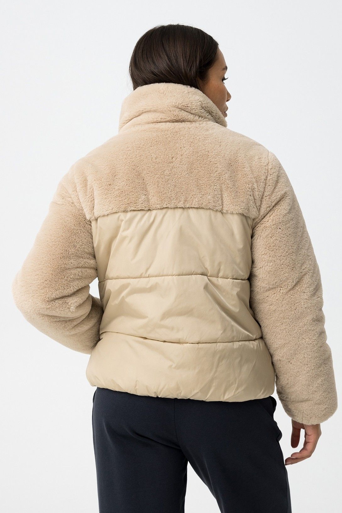 Abrigo relaxed fit acolchado de nylon, combinado con pelo sintético, dos bolsillos frontales y cierre de cremallera. Cuello alto, manga larga y terminaciones elásticas.