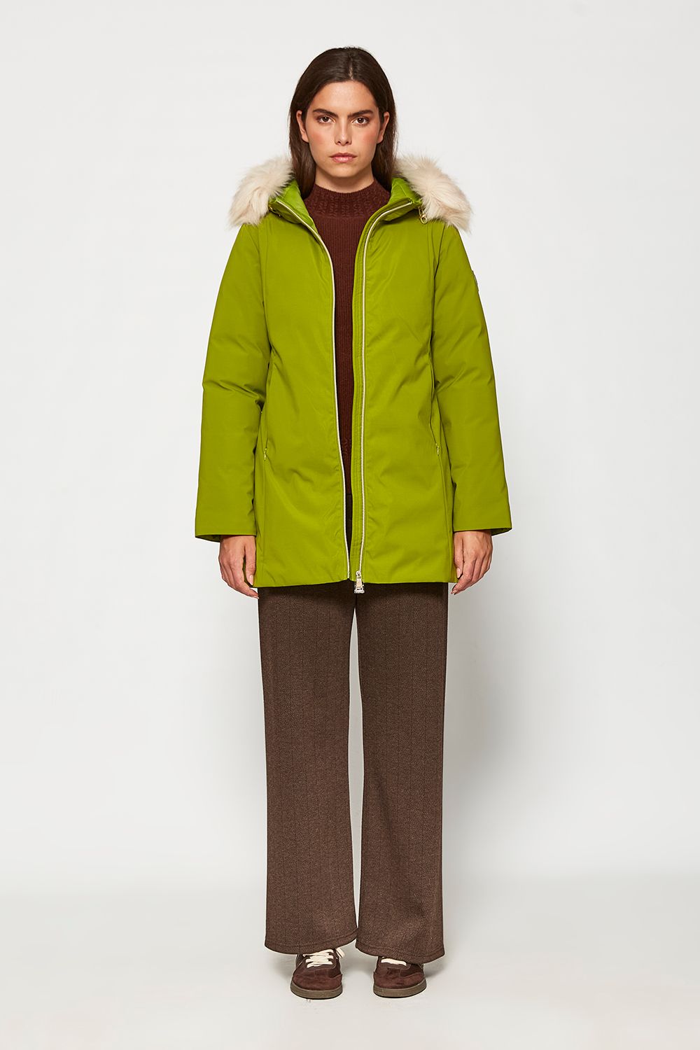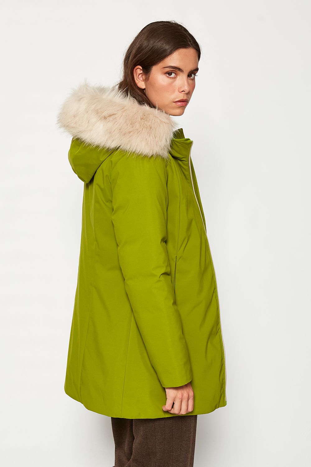 Parka larga con capucha de pelo blanco