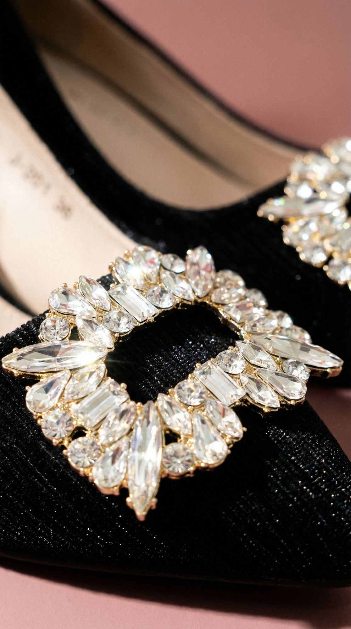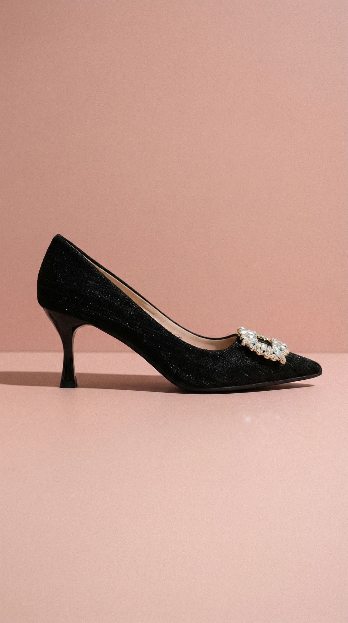 Salón en tejido negro con punta estilizada y una hebilla joya de cristales que aporta luz y contraste al diseño. La línea limpia del zapato permite que el protagonismo recaiga en el brillo de la pieza central, creando un equilibrio elegante entre sobriedad y detalle.