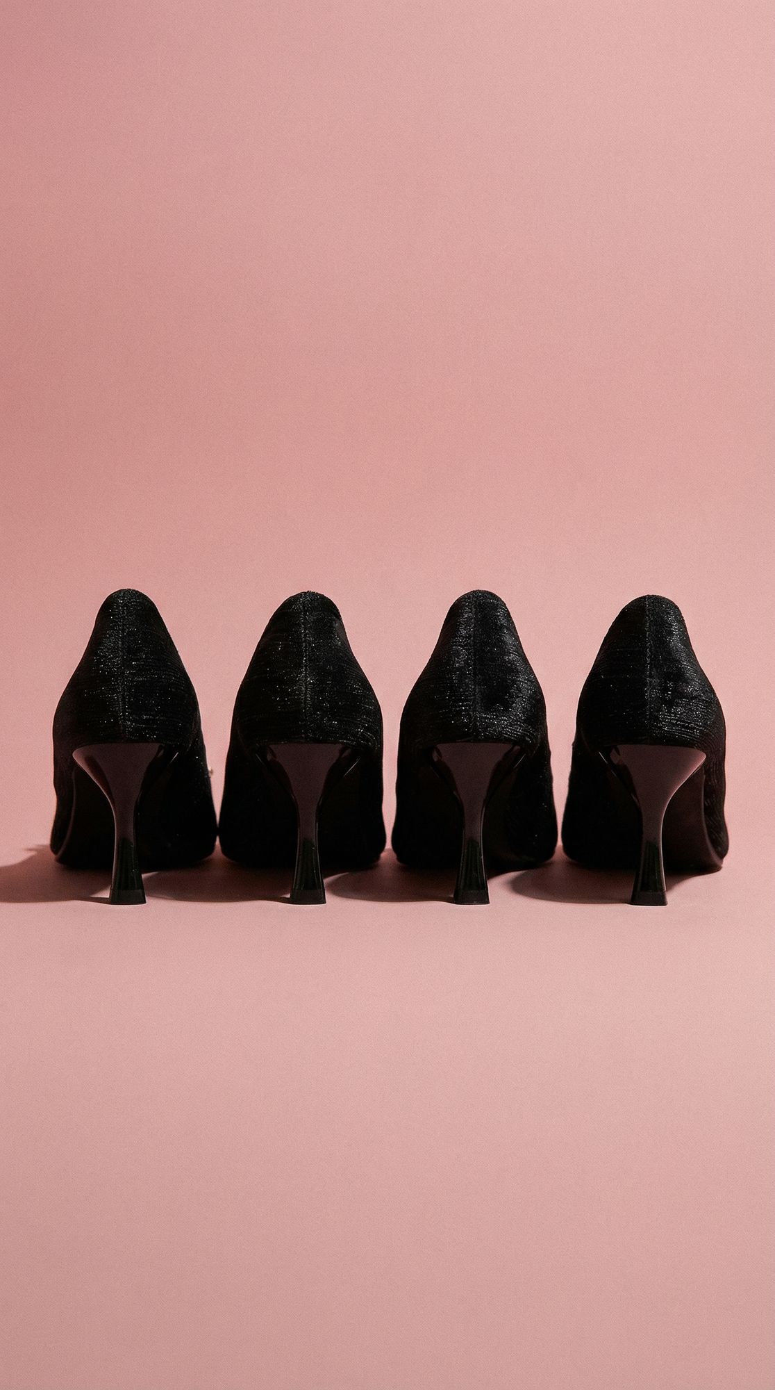 La silueta afinada y el tacón alto estilizan la pierna y acompañan con naturalidad los vestidos de la colección.