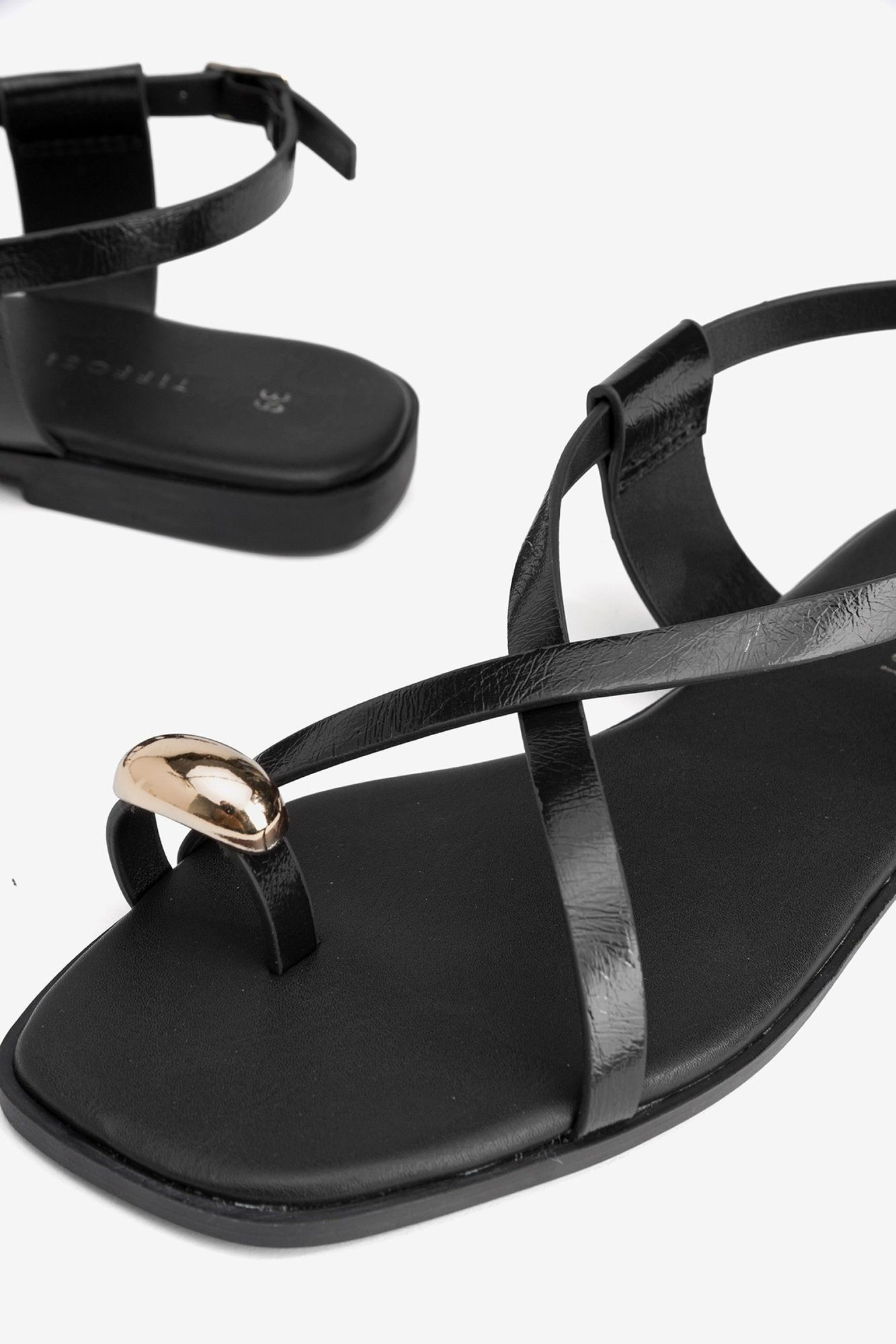 Sandalia de color negro con tiras finas cruzadas, detalle metálico dorado y cierre de hebilla lateral.