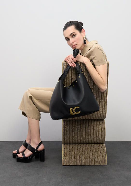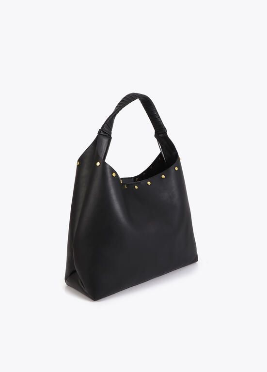 Bolso shopper con diseño elegante y logo metalizado. Decorado con tachas doradas y asa reforzada para mayor comodidad. Un complemento sofisticado para tu día a día.