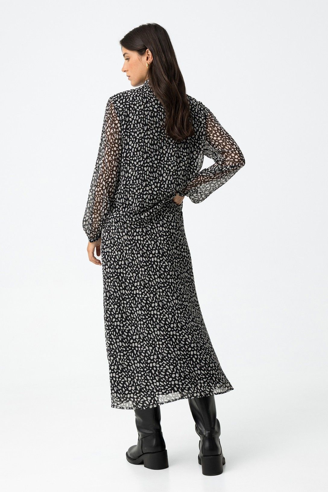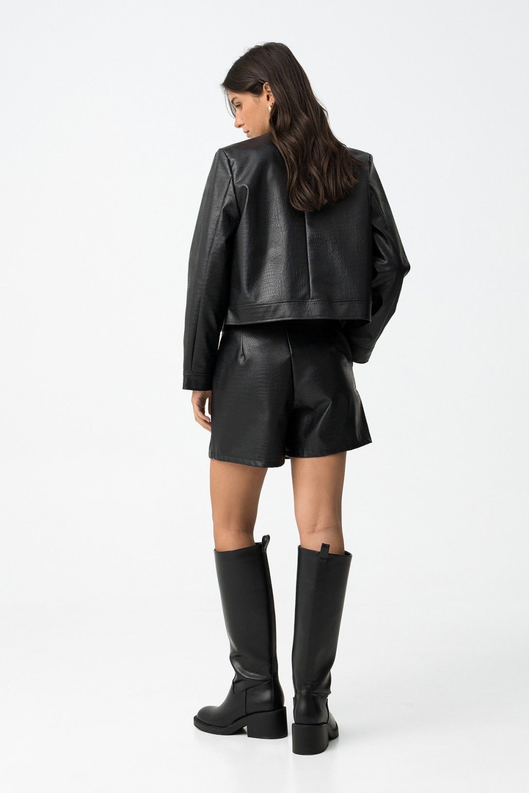 Skort efecto cocodrilo con dos bolsillos frontales y cierre de cremallera lateral.