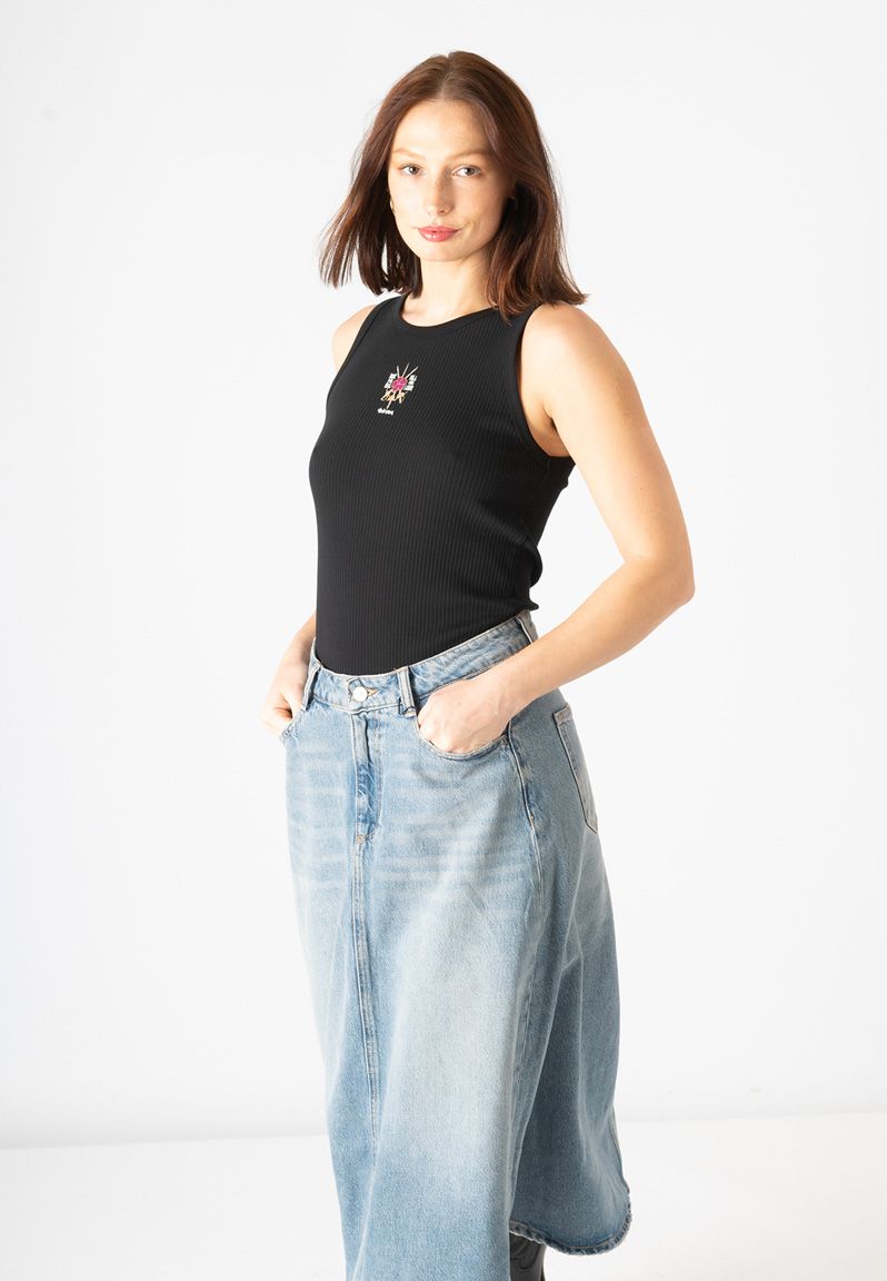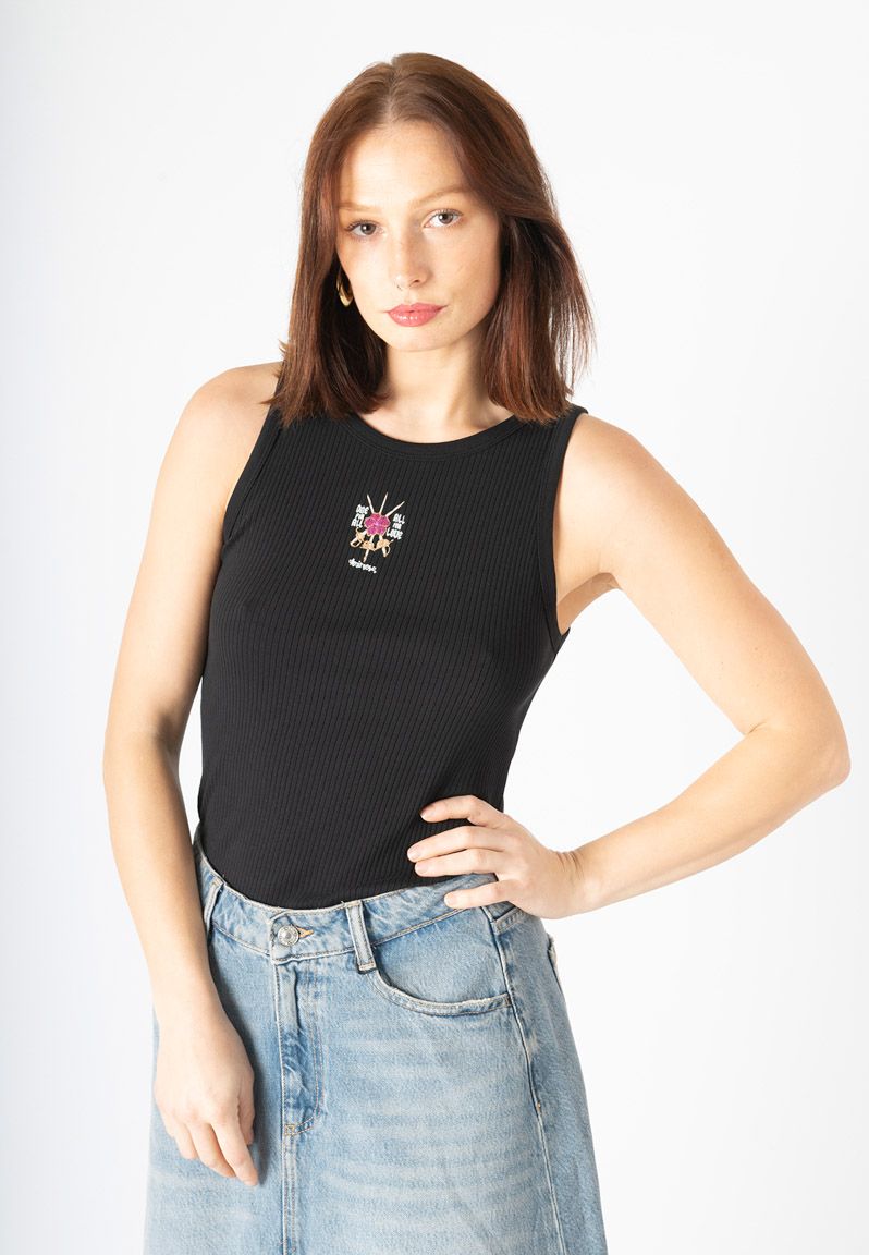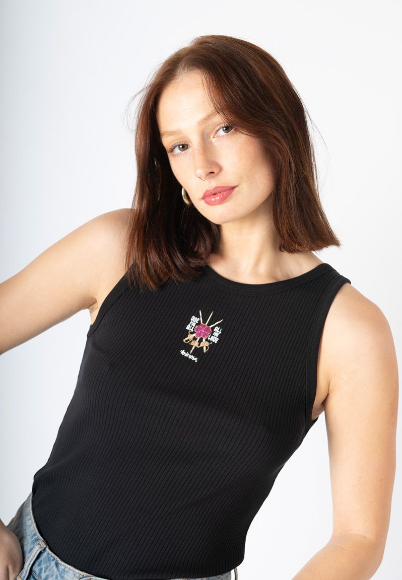 Top negro de tirantes, con ilustración de violeta con espadas cruzadas y mensaje a ambos lados. Todo el diseño tiene detalles en tinta metalizada. Si hubieran sido mosqueteras, con a, su lema hubiera sido “todas para una y todo por amor”. Porque cuando se hacen las cosas con amor, salen bien. El amor es ese ingrediente a prueba de egos, cansancio e intereses particulares. La prenda para las que saben que la lucha tiene que ser compartida. Diseño propio y fabricación en Portugal, cuidando hasta el más mínimo detalle. Todas nuestras prendas incluyen una etiqueta con un texto inspirador que puedes usar como marcapáginas. La modelo lleva una talla S, y sus medidas son: altura 170, pecho 88, cintura 68 y cadera 96 cm.