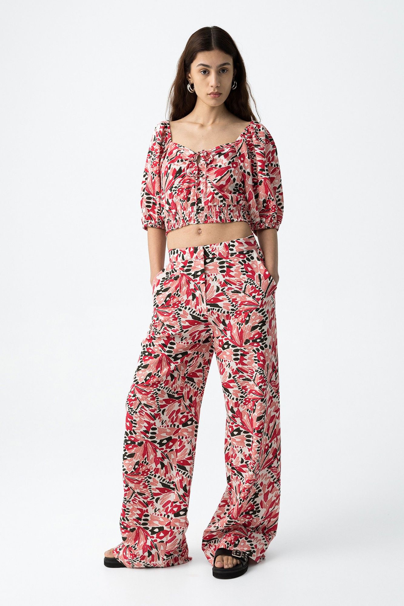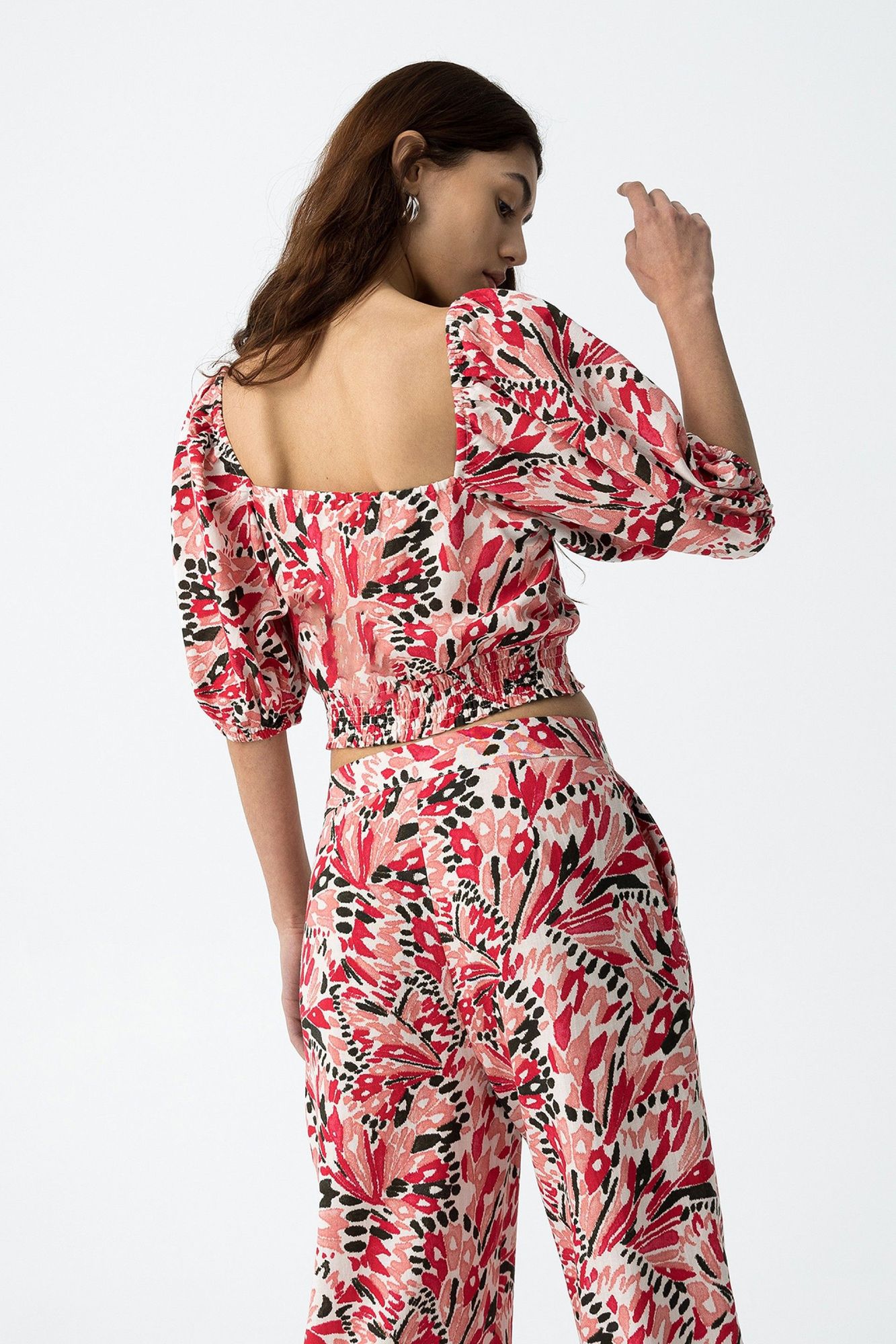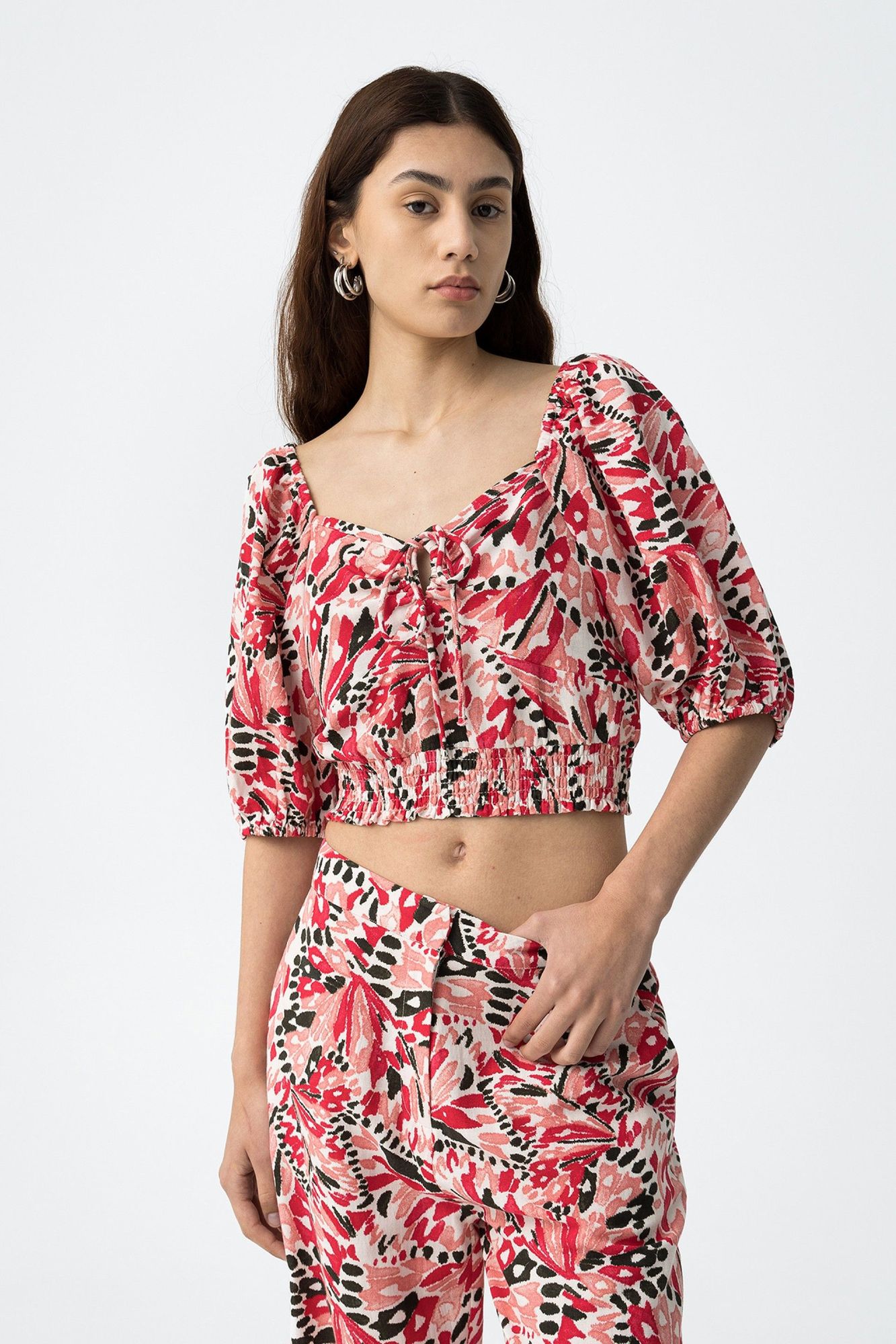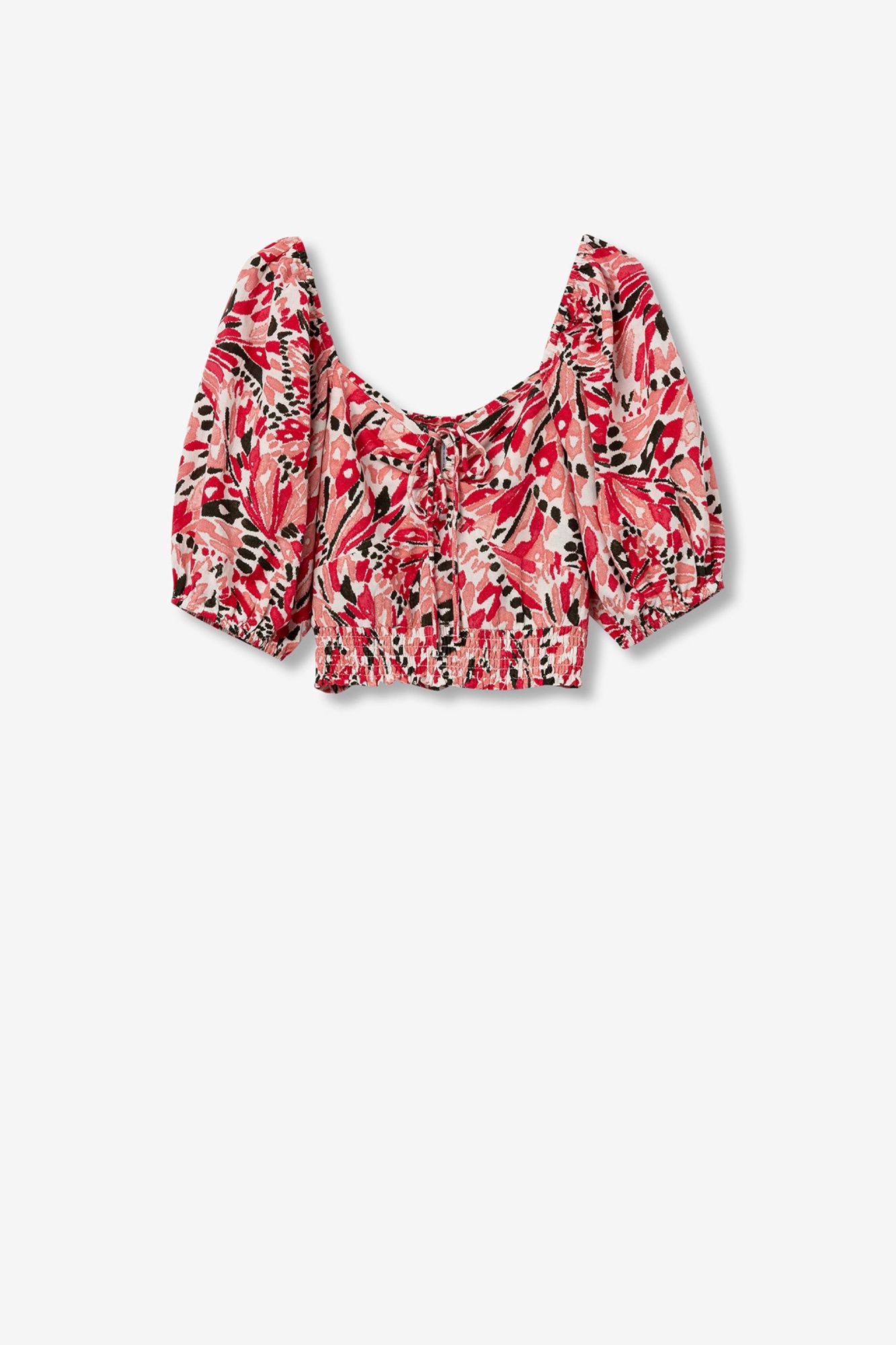 Top corto, con escote corazón y manga abullonada. Impreso por todas partes. Presenta un detalle de lazo ajustable en la parte delantera y una cinturilla elástica para un ajuste cómodo.
