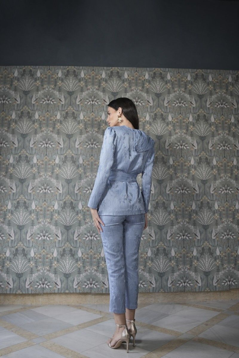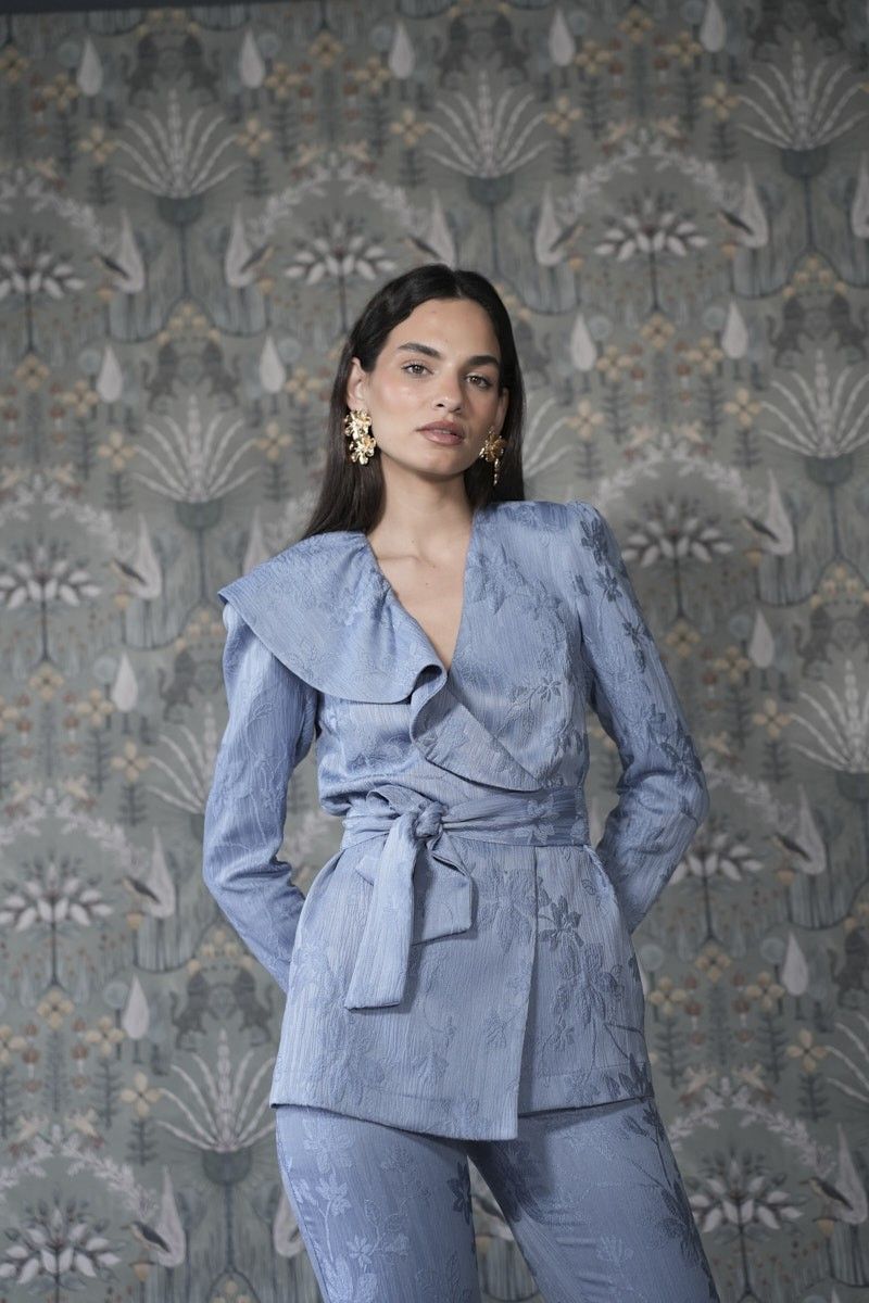 El traje Gaga es un conjunto de dos piezas confeccionado en tejido jacquard. La chaqueta ablusada con volante en el escote y lazada equilibra la figura, mientras que la hombrera añade estructura y presencia al look. El pantalón pitillo estiliza y alarga visualmente la silueta.