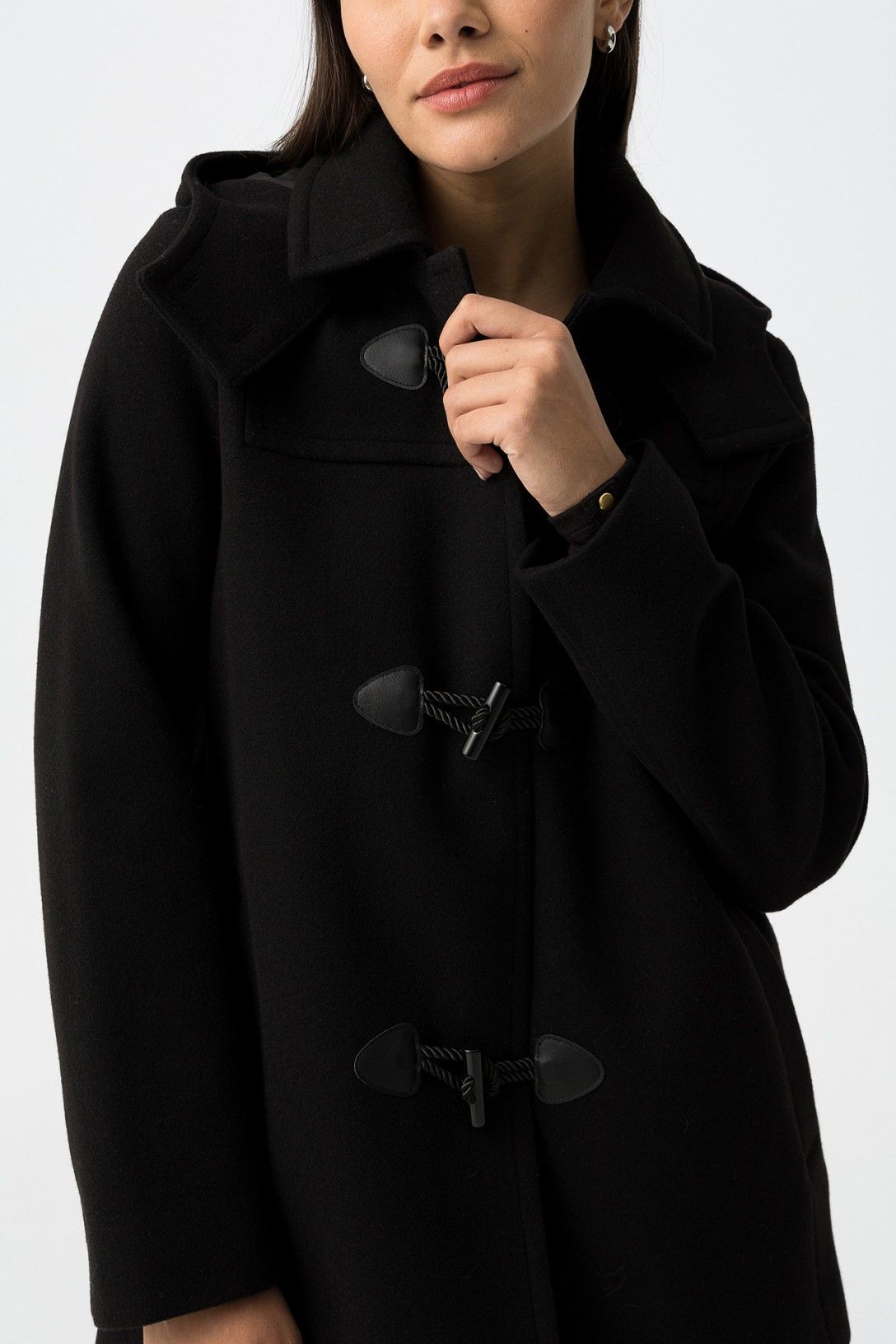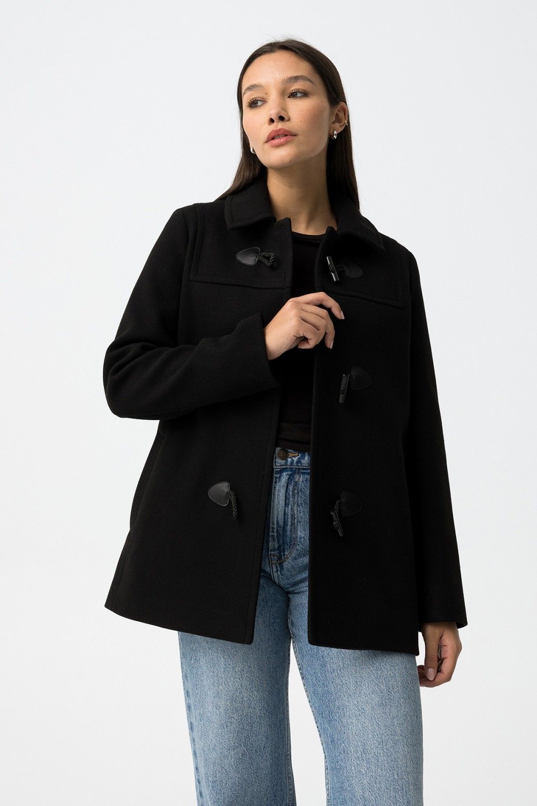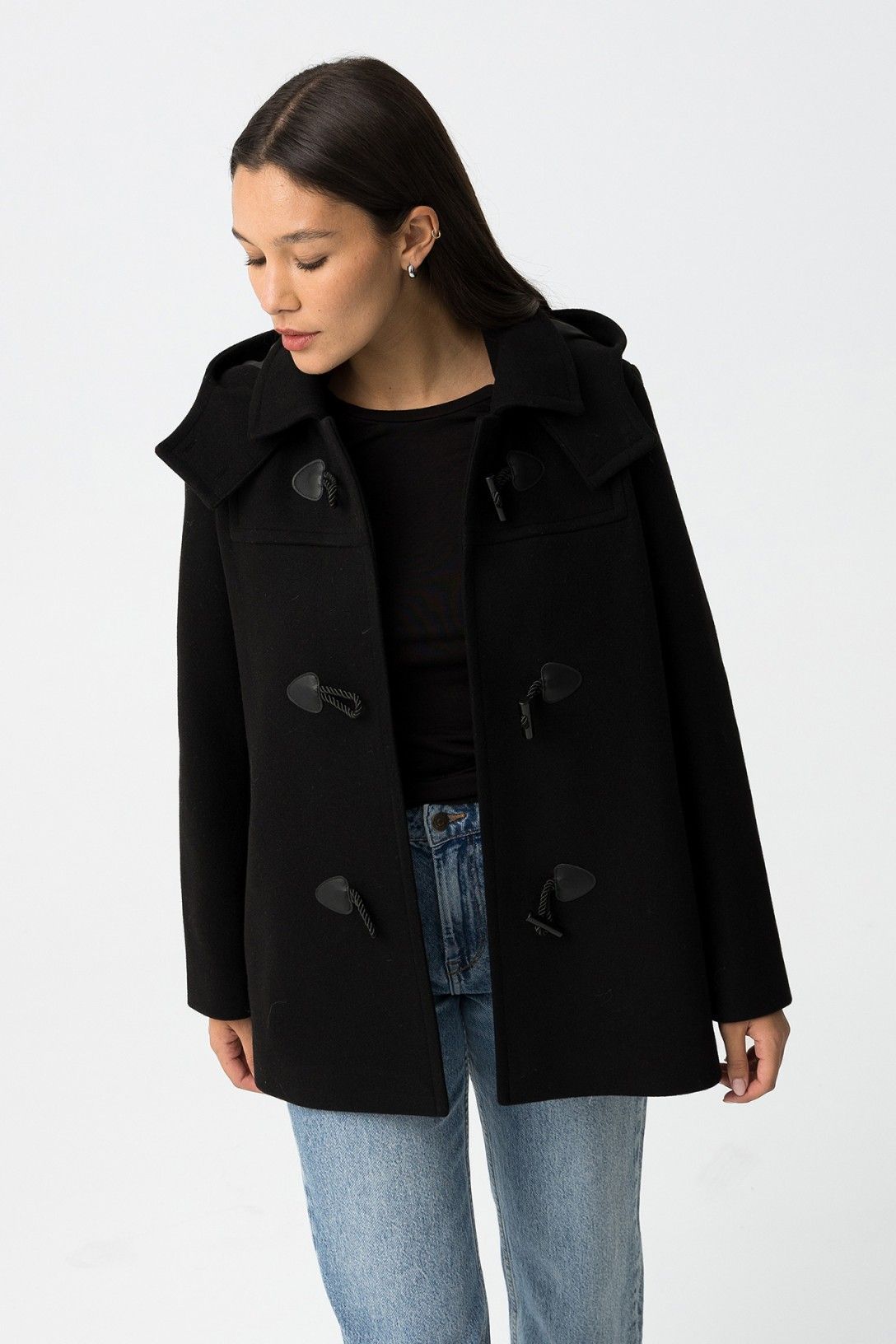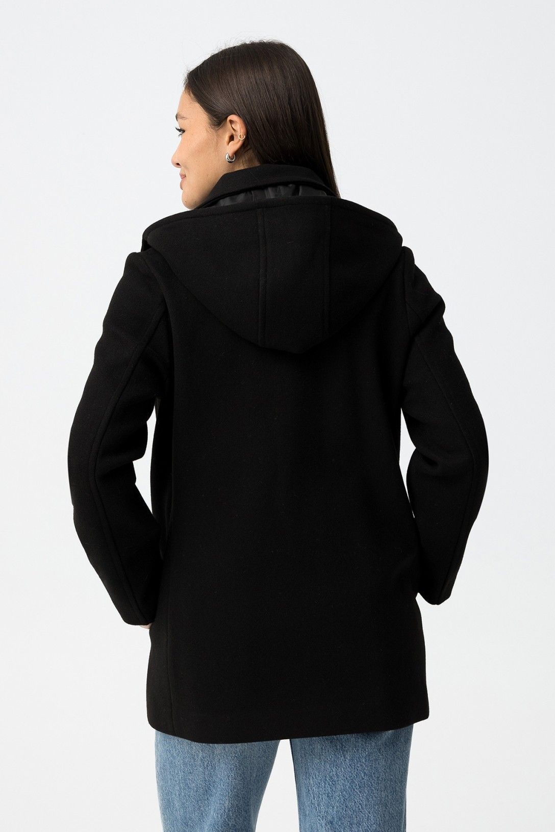 Abrigo regular fit con dos bolsillos, cierre alternado en la parte delantera y capucha desmontable. Cuello camisero y manga larga.