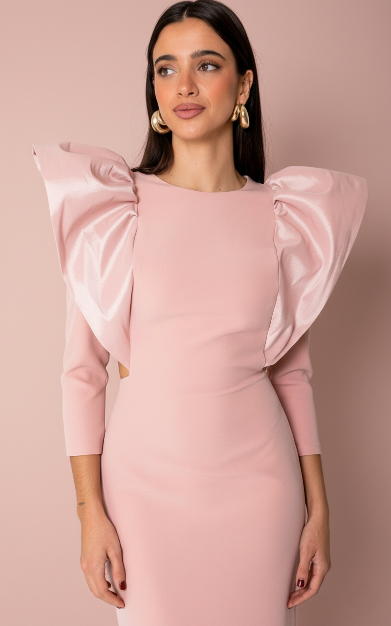 El cuerpo presenta un escote cerrado y mangas francesas, creando una parte superior sobria que equilibra el protagonismo de los volantes estructurados de tafetán en los hombros. Este contraste de tejidos aporta volumen controlado y marca la línea superior, estilizando visualmente la figura.