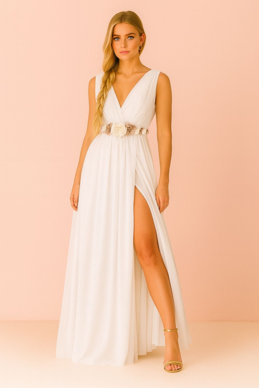 Incluye el cinturón de flores al tono del vestido para darle un toque dulce y romántico.