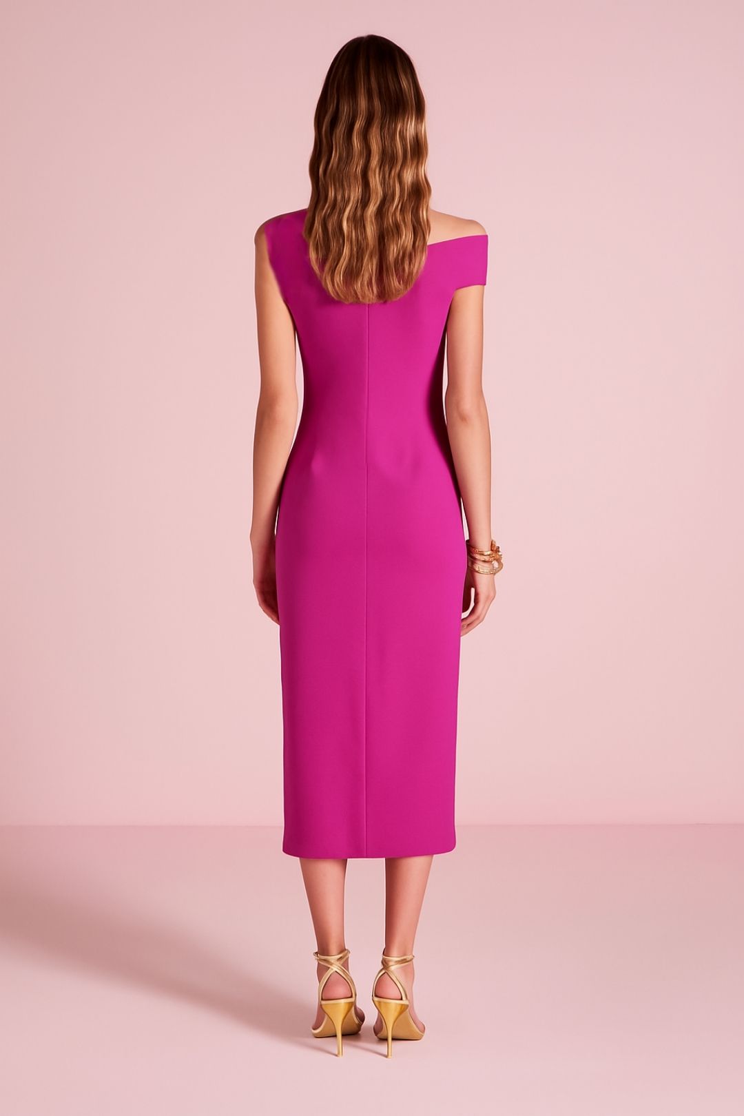 Vestido midi asimétrico con frunces laterales, abertura y detalle metálico en el hombro. Disponible en color fucsia. Ideal para invitadas de boda.