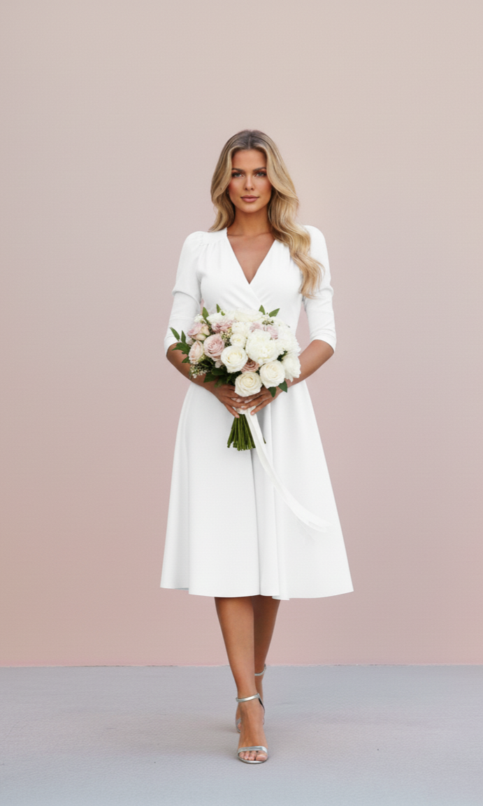 Ideal para una NOVIA que busca un vestido que refleje pureza y elegancia contemporánea para su preboda o boda, este vestido blanco midi es una elección sublime.