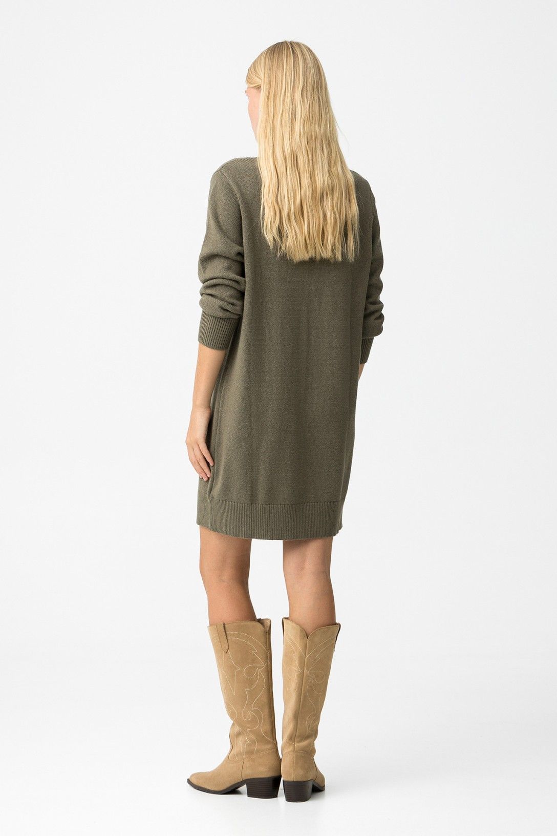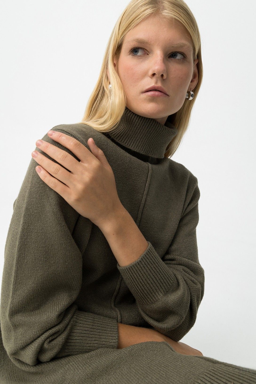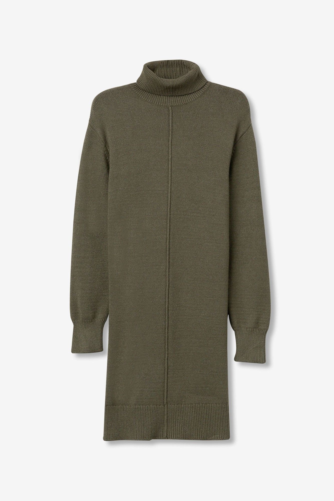 Vestido regular fit de punto, con costura frontal, cuello alto, manga larga y acabados en punto canalé.