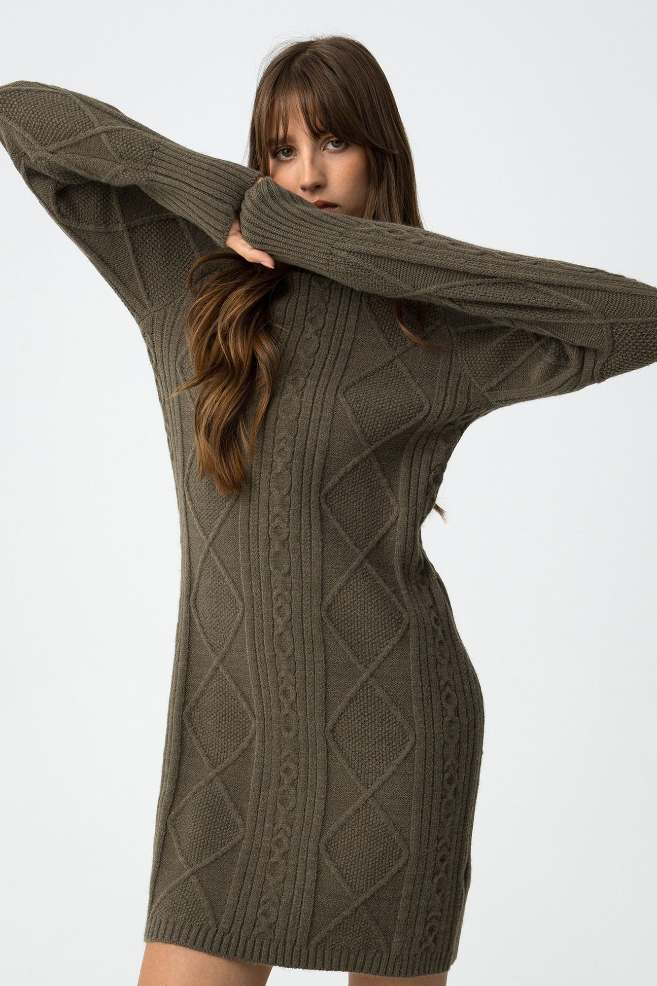 Vestido slim fit de punto trenzado, con cuello alto, manga larga y acabados acanalados.