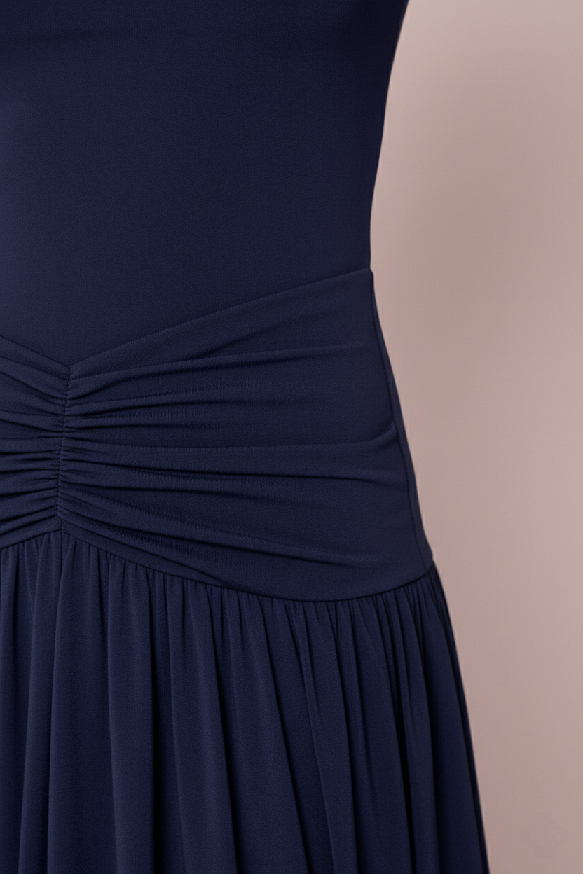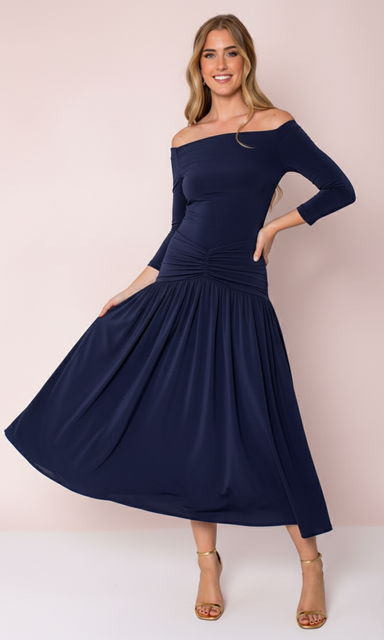 Ideal como vestido de invitada azul marino, vestido midi de fiesta o vestido para boda y eventos, cuando se busca una prenda que marque la silueta y aporte movimiento sin recargar el look.