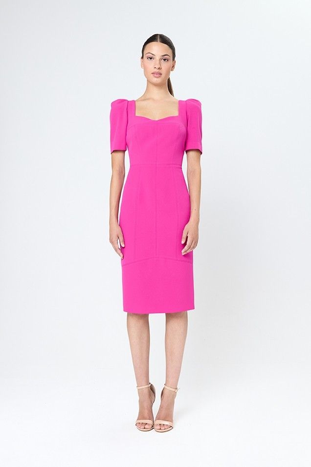 Este vestido fucsia de corte midi es ideal para mujeres que buscan un look elegante, favorecedor y con un punto sofisticado. Su diseño entallado realza la silueta y las mangas abullonadas con estructura equilibran el conjunto, dándole carácter sin recargar.