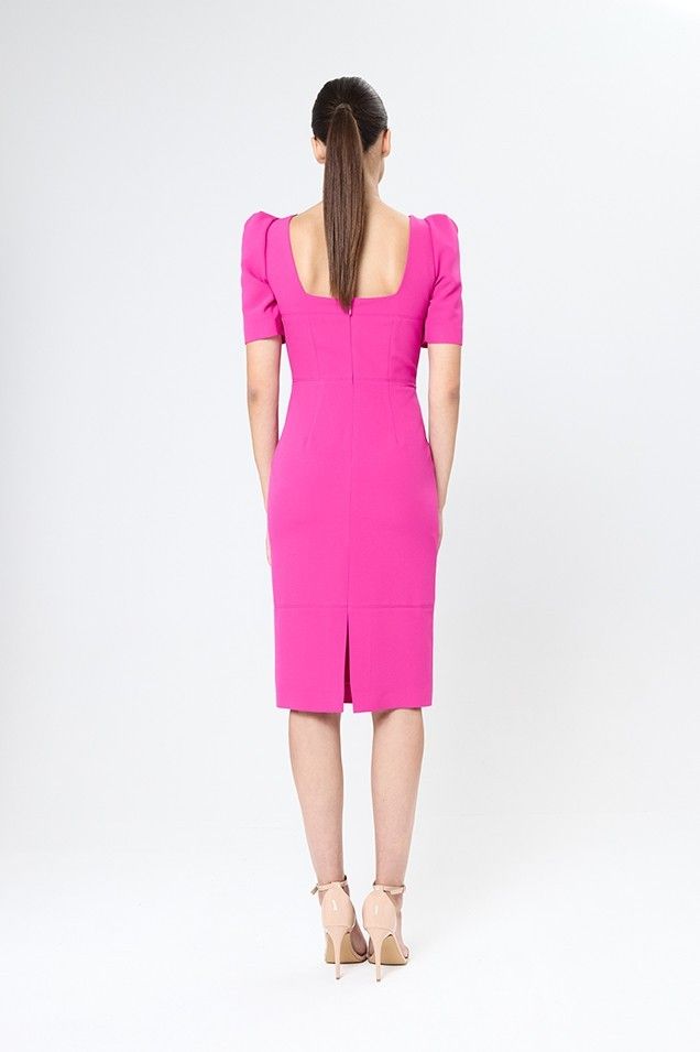 Vestido fucsia entallado con mangas abullonadas
