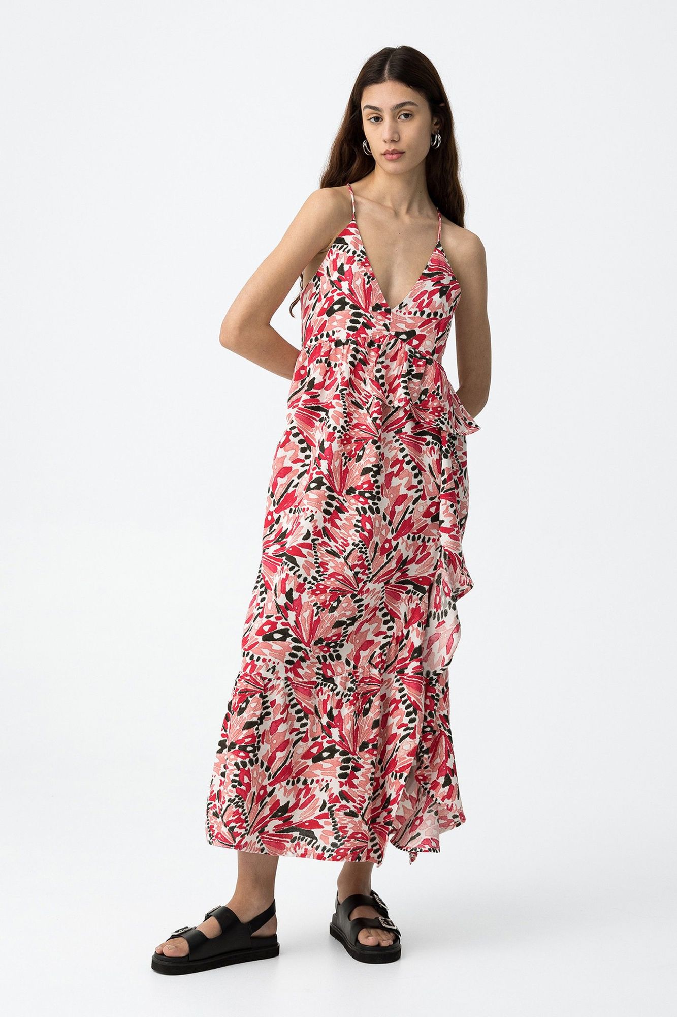 Vestido fluido con escote en pico y tirantes finos cruzados en la espalda. Impreso por todas partes. Con detalle de lazo lateral y capas en cascada.