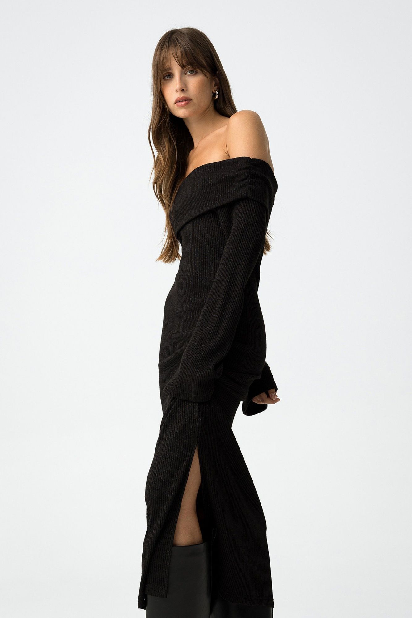 Vestido super ajustado de punto canalé con hilo metálico incorporado y hombros descubiertos. Escote recto y manga larga.