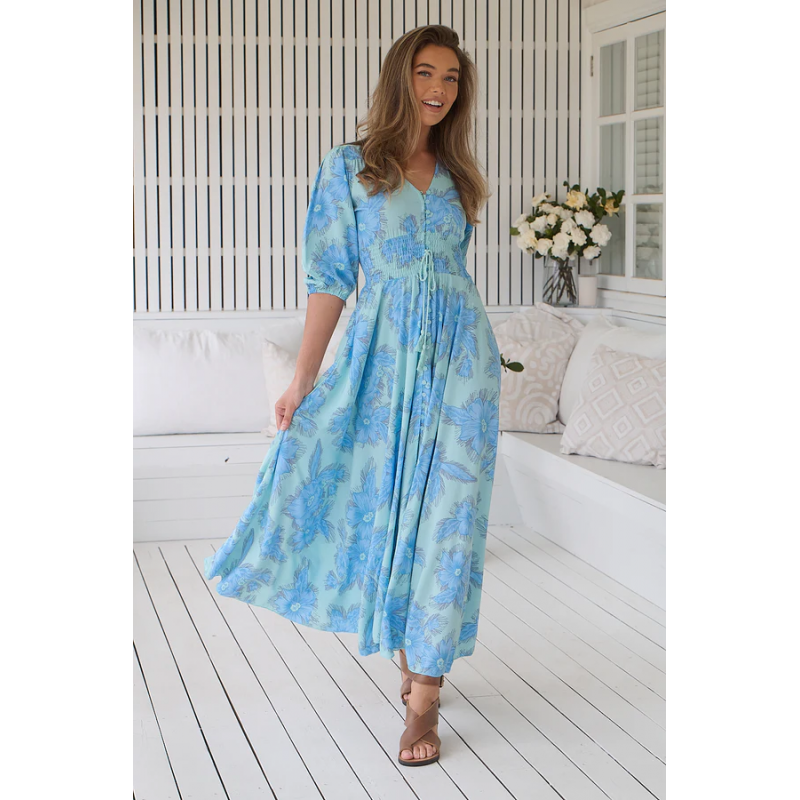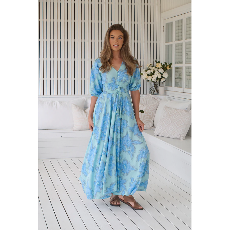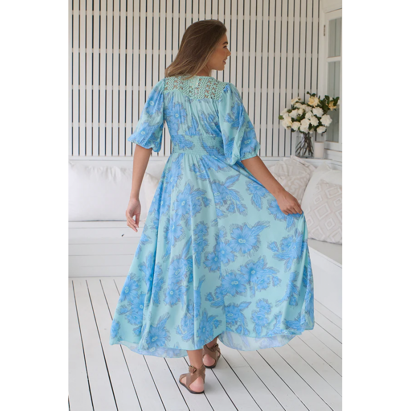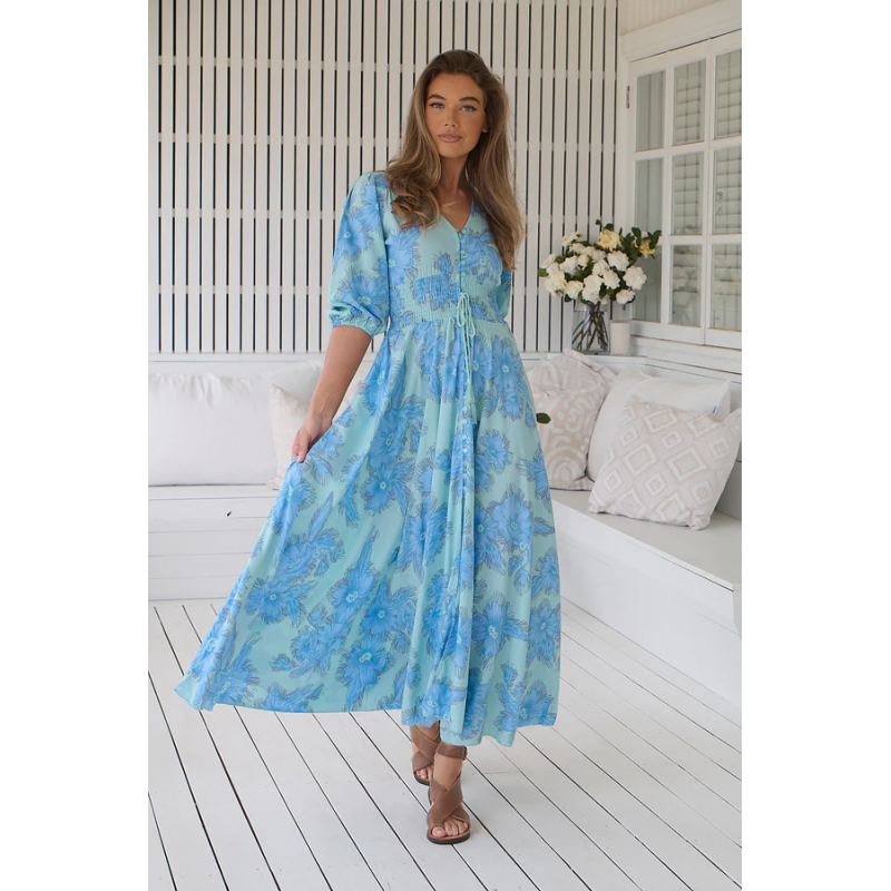 Vestido Summer Memories Indiana de la marca Jaase. Vestido con estampado de grandes flores azules sobre un fondo de tono más claro que es ideal para este verano ya que por su versatilidad puedes aprovecharlo en cualquier momento, ya sea un día casual u otro más especial.