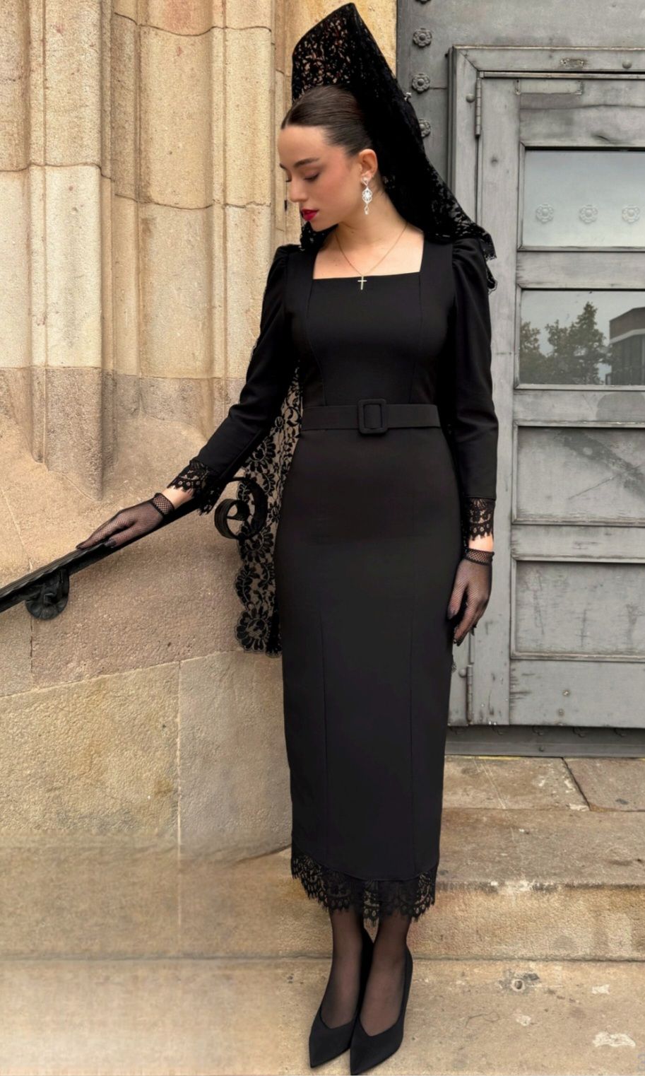 Es una opción muy adecuada si buscas vestido para salir de mantilla en Semana Santa o para asistir a una procesión con una estética elegante y discreta.