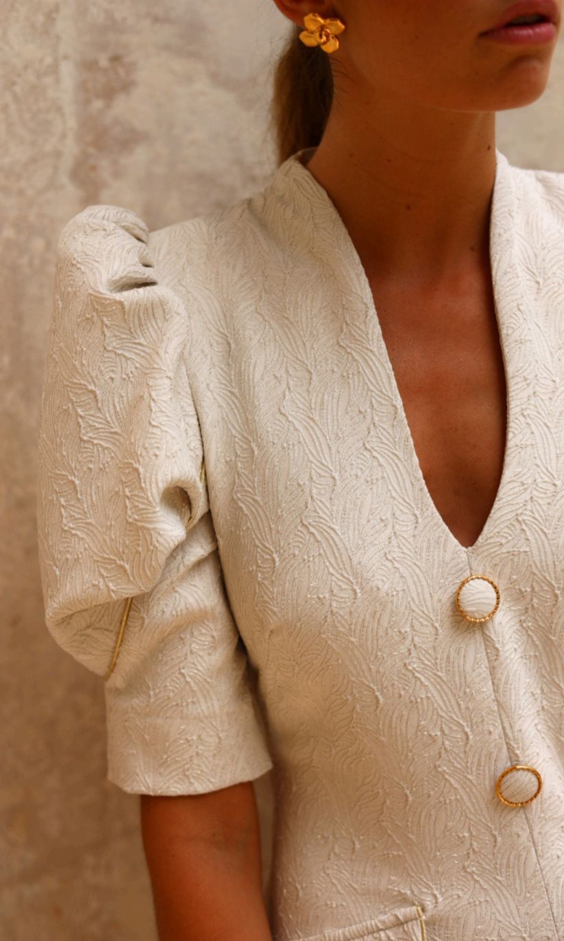 Vestido midi de invitada confeccionado en tejido jacquard en color marfil, con relieve y estructura que aporta cuerpo, firmeza y un acabado elegante. Un diseño pensado para mujeres que buscan un vestido especial para eventos de día, celebraciones formales o looks de madrina y madre de comunión.